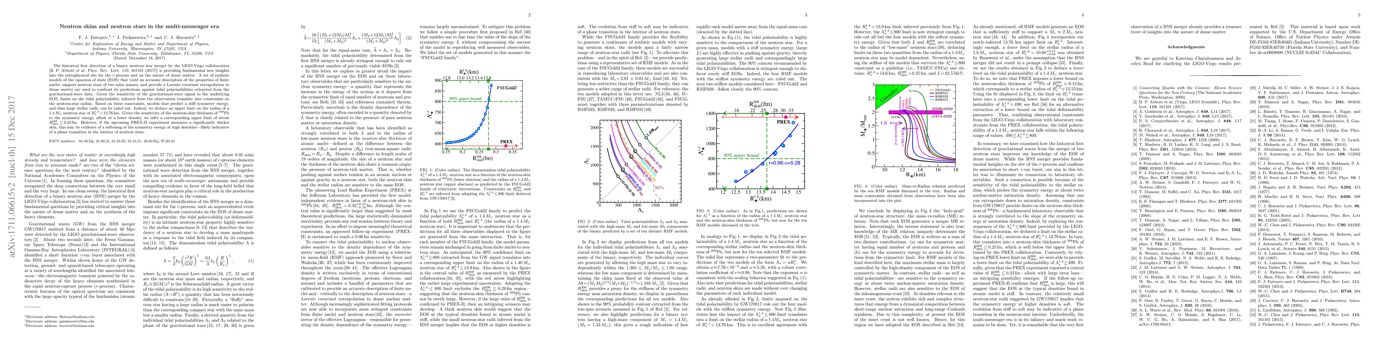 The paper discusses the implications of the first binary neutron star merger detection, linking it to insights on nuclear astrophysics and dense matter. It uses EOS models to constrain neutron star radii to less than 13.76 km at 1.4 solar masses, and neutron skin thickness of Pb-208 to less than 0.25 fm. A significant discrepancy in the neutron skin thickness from upcoming PREX-II experiment could indicate a phase transition within neutron stars.