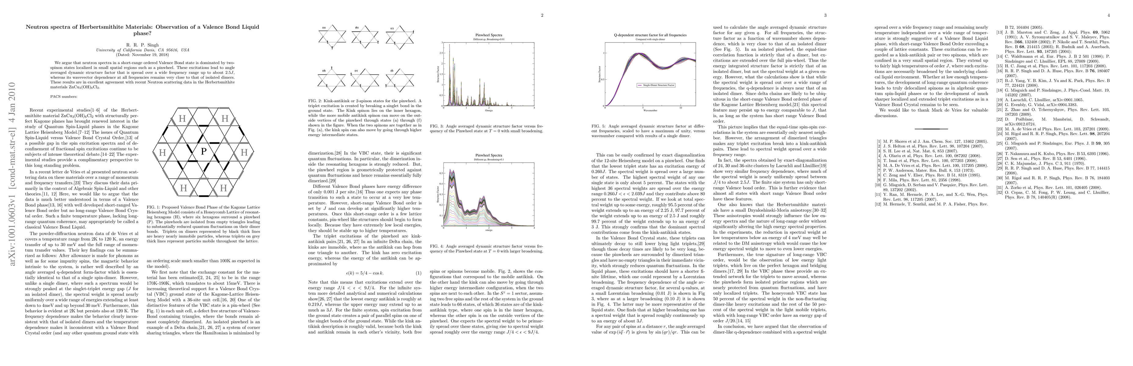 Summary: Neutron spectra in Herbertsmithite materials suggest the presence of a short-range ordered Valence Bond Liquid phase characterized by two-spinon excitations, which produce a wide-frequency dynamic structure factor consistent with recent neutron scattering data.