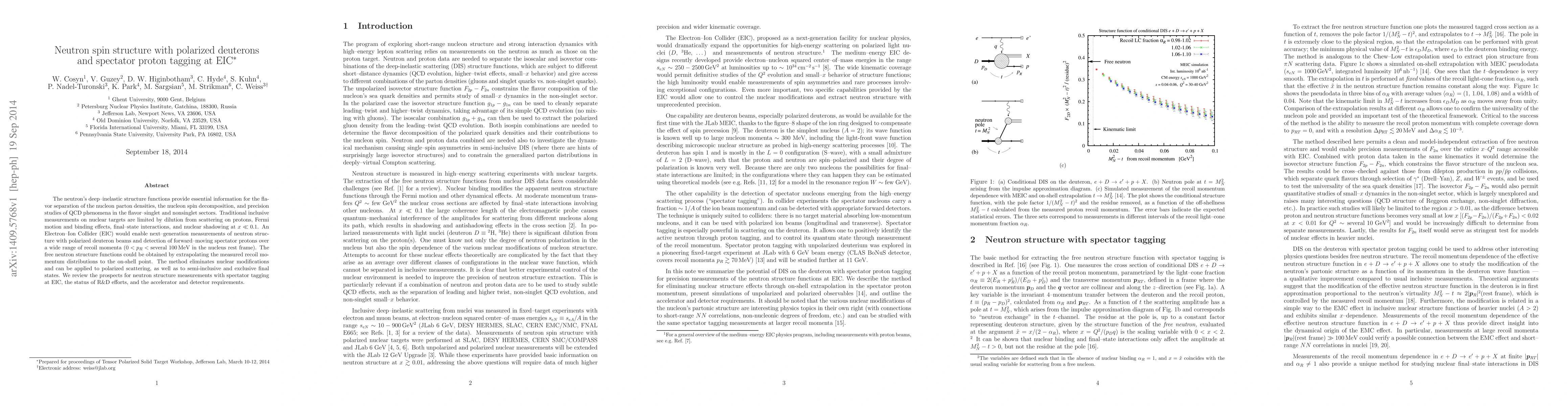 This paper discusses the potential of an Electron-Ion Collider (EIC) to measure neutron spin structure using polarized deuteron beams and spectator proton tagging, which can overcome limitations of traditional nuclear target measurements. The method aims to obtain free neutron structure functions by extrapolating recoil momentum distributions, thus eliminating nuclear effects.