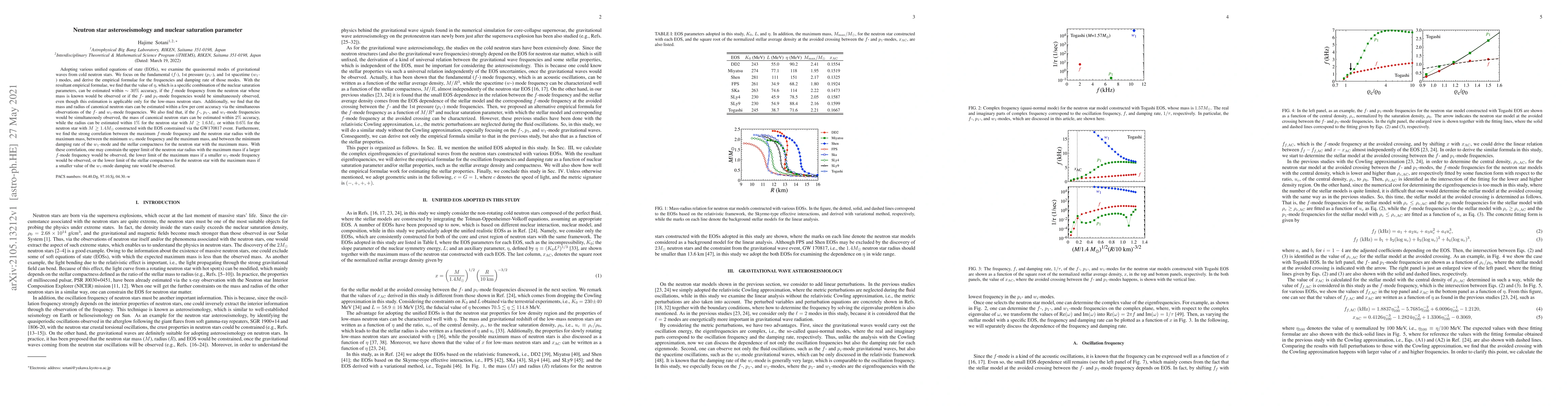 This paper investigates neutron star asteroseismology using various unified equations of state, deriving empirical formulae for gravitational wave frequencies and damping rates of fundamental, pressure, and spacetime modes. The study estimates nuclear saturation parameters and the mass and radius of neutron stars with high accuracy through observations of these modes, particularly for low-mass neutron stars.