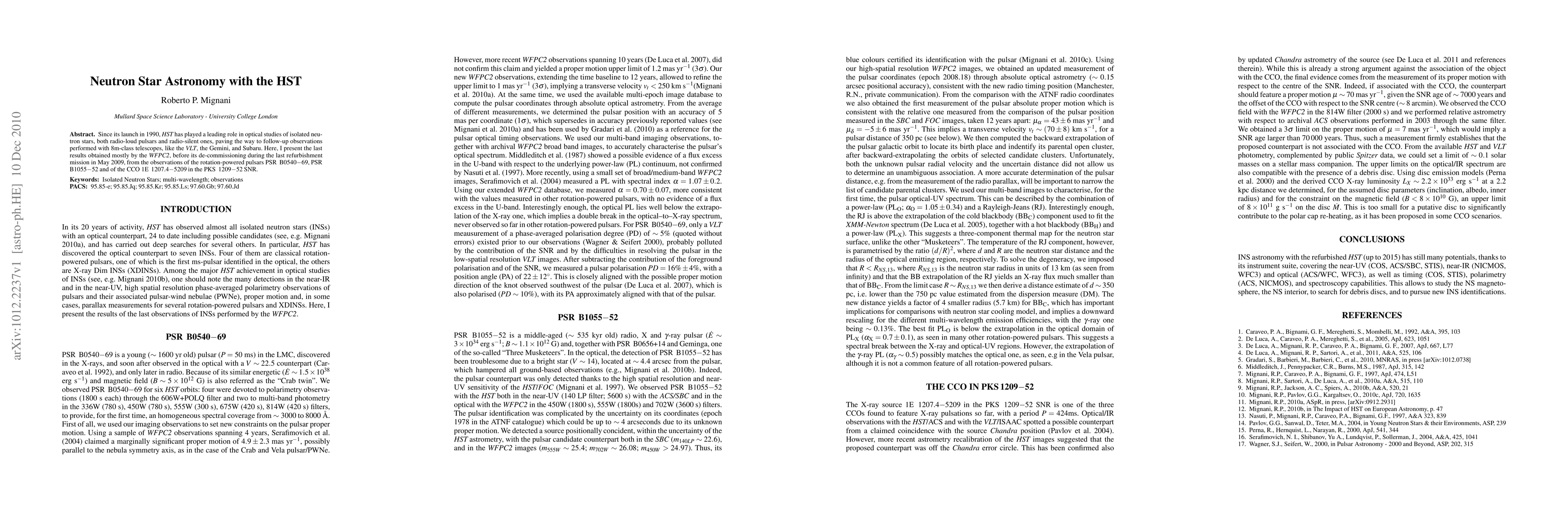 Since its launch in 1990, HST has played a leading role in optical studies of isolated neutron stars, both radio-loud pulsars and radio-silent ones, paving the way to follow-up observations performed with 8m-class telescopes, like the VLT, the Gemini, and Subaru. Here, I present the last results obtained mostly by the WFPC2, before its de-commissioning during the last refurbishment mission in May 2009, from the observations of the rotation-powered pulsars PSR B0540-69, PSR B1055-52 and of the CCO 1E 1207.4-5209 in the PKS 1209-52 SNR.