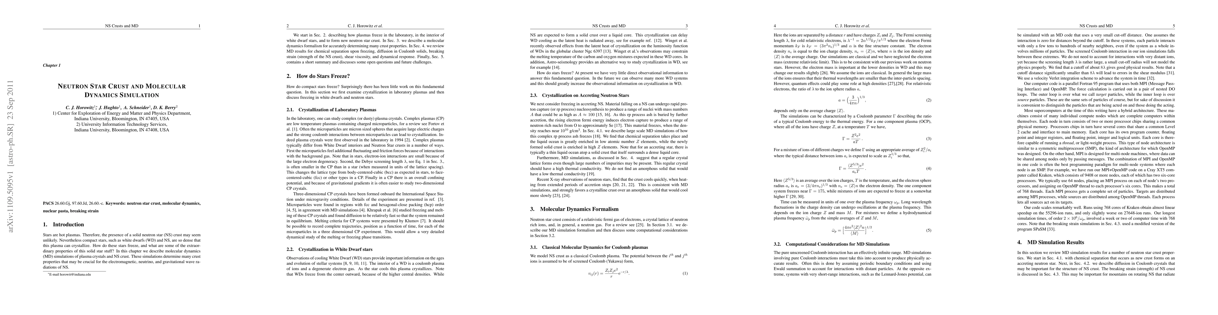 This paper reviews plasma crystals in various astrophysical environments and applies molecular dynamics simulations to study neutron star crust properties, including phase separation, diffusion, breaking strain, shear viscosity, and nuclear pasta dynamics. It concludes with a discussion of open questions and future challenges.