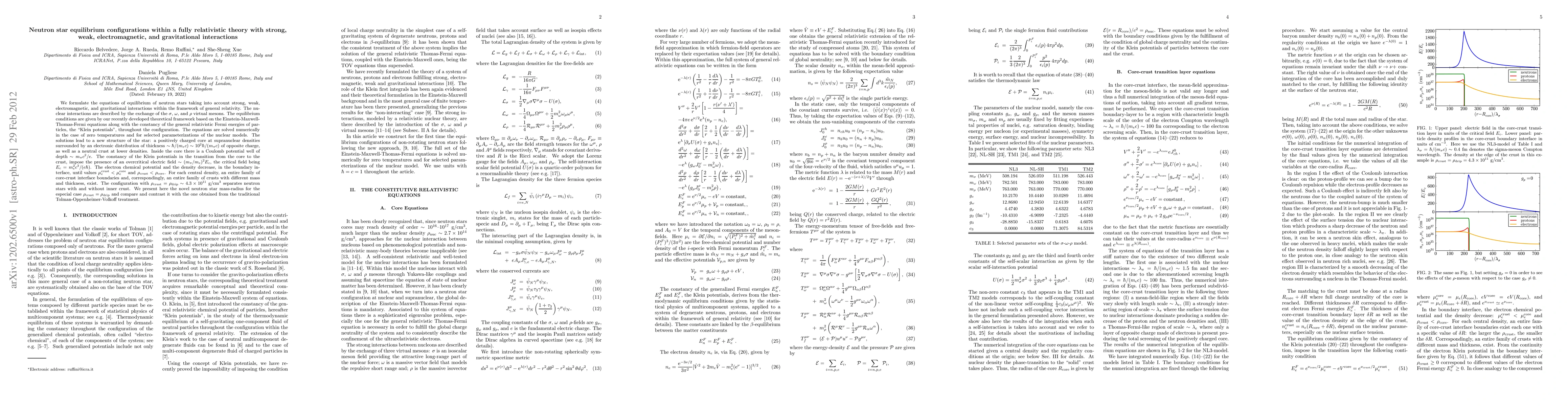 We formulate the equations of equilibrium of neutron stars taking into account strong, weak, electromagnetic, and gravitational interactions within the framework of general relativity. The nuclear interactions are described by the exchange of the sigma, omega, and rho virtual mesons. The equilibrium conditions are given by our recently developed theoretical framework based on the Einstein-Maxwell-Thomas-Fermi equations along with the constancy of the general relativistic Fermi energies of particles, the "Klein potentials", throughout the configuration. The equations are solved numerically in the case of zero temperatures and for selected parametrization of the nuclear models. The solutions lead to a new structure of the star: a positively charged core at supranuclear densities surrounded by an electronic distribution of thickness $\sim \hbar/(m_e c)$ of opposite charge, as well as a neutral crust at lower densities. Inside the core there is a Coulomb potential well of depth $\sim m_\pi c^2/e$. The constancy of the Klein potentials in the transition from the core to the crust, impose the presence of an overcritical electric field $\sim (m_\pi/m_e)^2 E_c$, the critical field being $E_c=m^2_e c^3/(e \hbar)$. The electron chemical potential and the density decrease, in the boundary interface, until values $\mu^{\rm crust}_e < \mu^{\rm core}_e$ and $\rho_{\rm crust}<\rho_{\rm core}$. For each central density, an entire family of core-crust interface boundaries and, correspondingly, an entire family of crusts with different mass and thickness, exist. The configuration with $\rho_{\rm crust}=\rho_{\rm drip}\sim 4.3\times 10^{11}$ g/cm$^3$ separates neutron stars with and without inner crust. We present here the novel neutron star mass-radius for the case $\rho_{\rm crust}=\rho_{\rm drip}$ and compare and contrast it with the one obtained from the Tolman-Oppenheimer-Volkoff treatment.