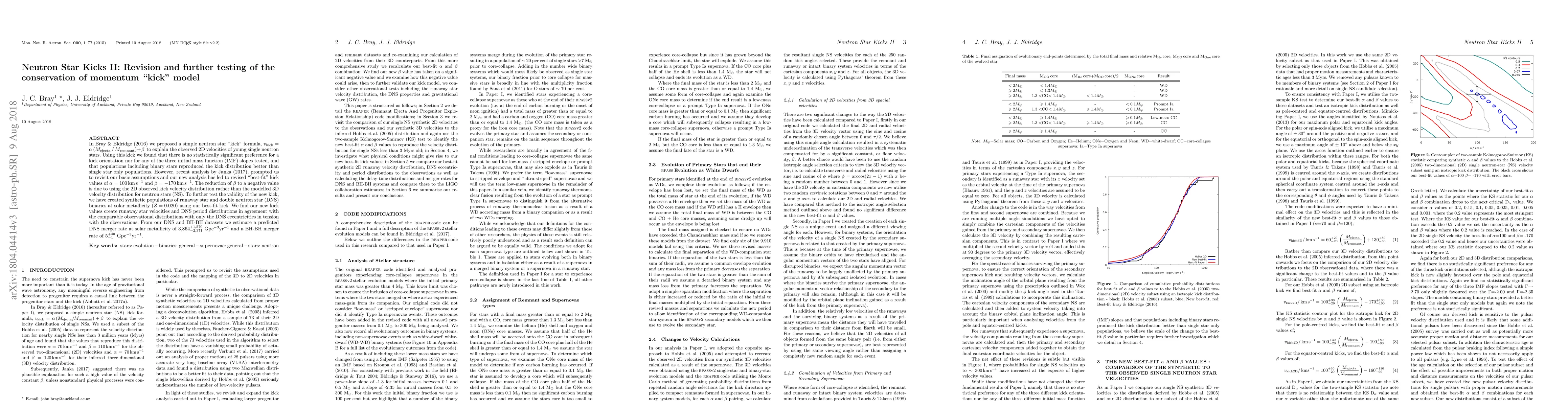 In Bray and Eldridge (2017), we proposed a simple neutron star kick formula, v kick = alpha (M ejecta / M remnant) + beta to explain the observed 2D velocities of young single neutron stars. Using this kick we found that there is no statistically significant preference for a kick orientation nor for any of the three initial mass function (IMF) slopes tested, and that populations including binary stars reproduced the kick distribution better than single star only populations. However, recent analysis by Janka (2017), prompted us to revisit our basic assumptions and our new analysis has led to revised best-fit kick values of alpha=100 km per second and beta = -170 km per second. The reduction of beta to a negative value is due to using the 2D observed kick velocity distribution rather than the modelled 3D velocity distribution for neutron stars (NS). To further test the validity of the new kick, we have created synthetic populations of runaway star and double neutron star (DNS) binaries at solar metallicity (Z=0.02) using our best-fit kick. We find our new kick values create runaway star velocities and DNS period distributions in agreement with the comparable observational distributions with only the DNS eccentricities in tension with the observations. From our DNS and BH-BH datasets we estimate a predicted DNS merger rate at solar metallicity of 3,864 (+1,570/-2,371) per cubic Gpc per yr and a BH-BH merger rate of 5 (+40/-1) per cubic Gpc per yr.