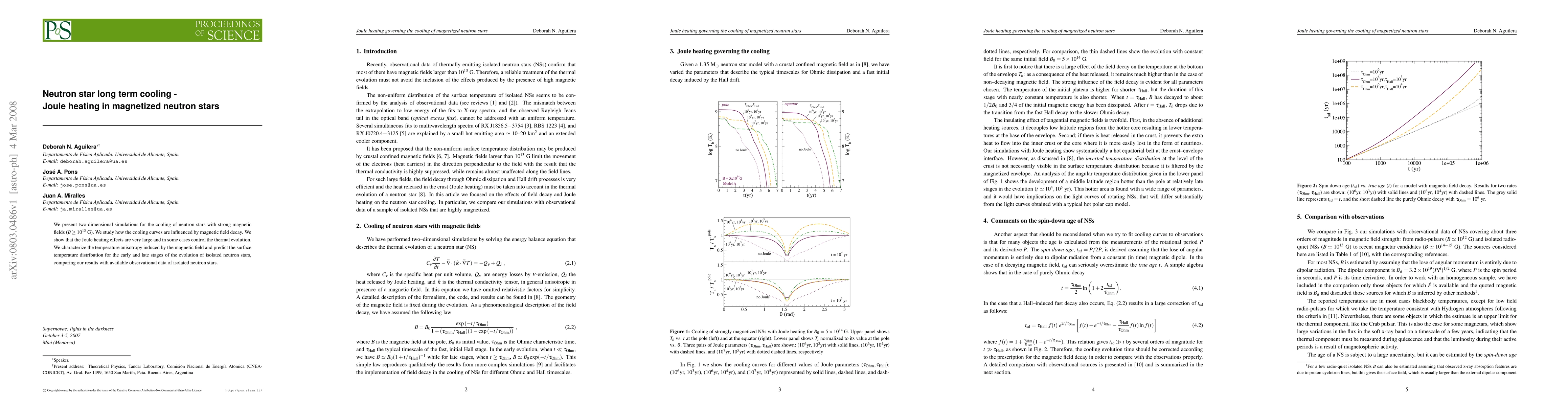 This paper presents two-dimensional simulations of neutron star cooling, focusing on the influence of magnetic field decay and Joule heating in stars with strong magnetic fields. The study finds that Joule heating significantly impacts thermal evolution and predicts temperature anisotropy and surface temperature distribution, comparing results with observational data.