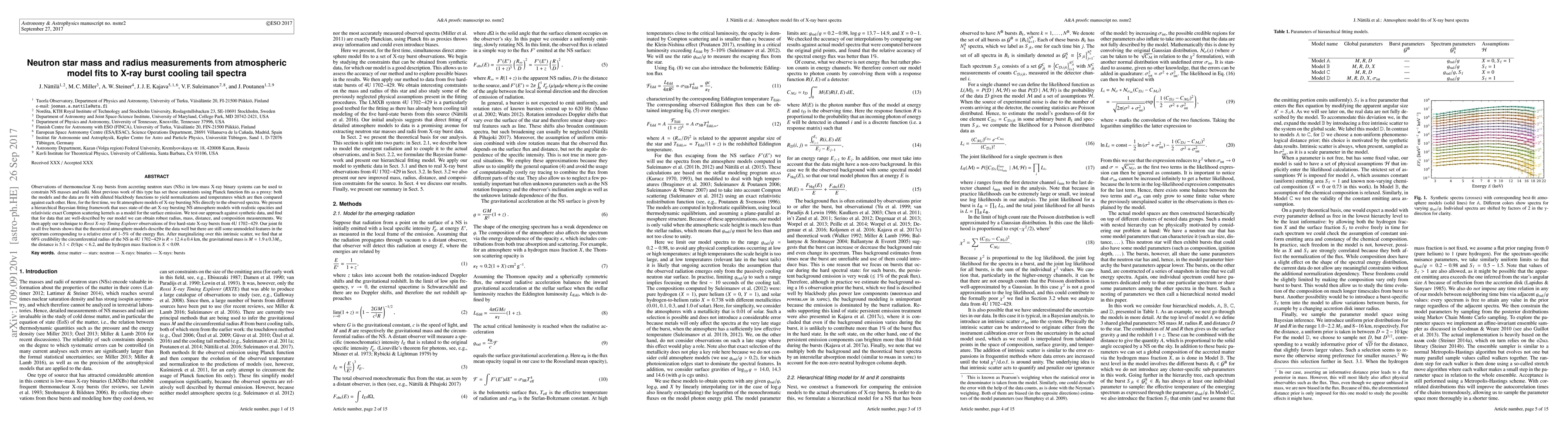 Observations of thermonuclear X-ray bursts from accreting neutron stars (NSs) in low-mass X-ray binary systems can be used to constrain NS masses and radii. Most previous work of this type has set these constraints using Planck function fits as a proxy: both the models and the data are fit with diluted blackbody functions to yield normalizations and temperatures which are then compared against each other. Here, for the first time, we fit atmosphere models of X-ray bursting NSs directly to the observed spectra. We present a hierarchical Bayesian fitting framework that uses state-of-the-art X-ray bursting NS atmosphere models with realistic opacities and relativistic exact Compton scattering kernels as a model for the surface emission. We test our approach against synthetic data, and find that for data that are well-described by our model we can obtain robust radius, mass, distance, and composition measurements. We then apply our technique to Rossi X-ray Timing Explorer observations of five hard-state X-ray bursts from 4U 1702-429. Our joint fit to all five bursts shows that the theoretical atmosphere models describe the data well but there are still some unmodeled features in the spectrum corresponding to a relative error of 1-5% of the energy flux. After marginalizing over this intrinsic scatter, we find that at 68% credibility the circumferential radius of the NS in 4U 1702-429 is R = 12.4+-0.4 km, the gravitational mass is M=1.9+-0.3 Msun, the distance is 5.1 < D/kpc < 6.2, and the hydrogen mass fraction is X < 0.09.