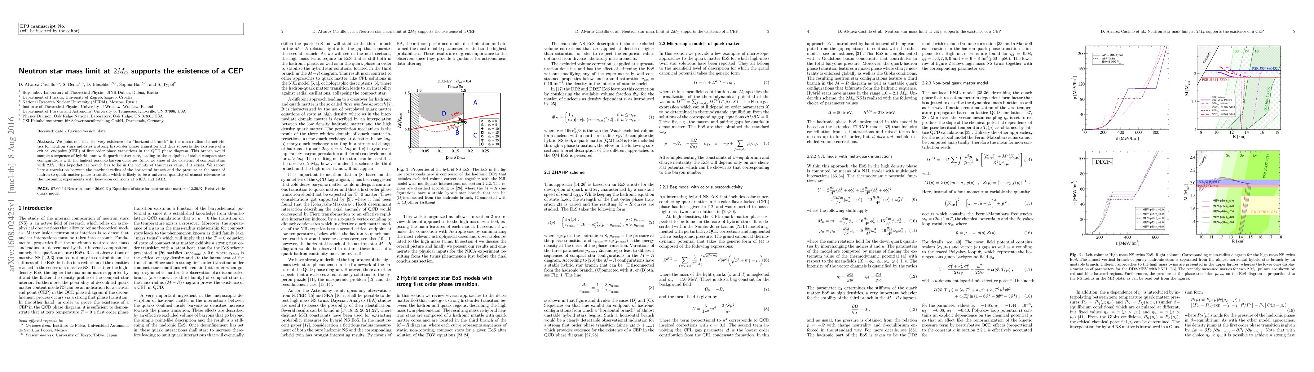 We point out that the very existence of a "horizontal branch" in the mass-radius characteristics for neutron stars indicates a strong first-order phase transition and thus supports the existence of a critical endpoint (CEP) of first order phase transitions in the QCD phase diagram. This branch would sample a sequence of hybrid stars with quark matter core, leading to the endpoint of stable compact star configurations with the highest possible baryon densities. Since we know of the existence of compact stars with $2M_\odot$, this hypothetical branch has to lie in the vicinity of this mass value, if it exists. We report here a correlation between the maximal radius of the horizontal branch and the pressure at the onset of hadron-to-quark matter phase transition which is likely to be a universal quantity of utmost relevance to the upcoming experiments with heavy-ion collisions at NICA and FAIR.