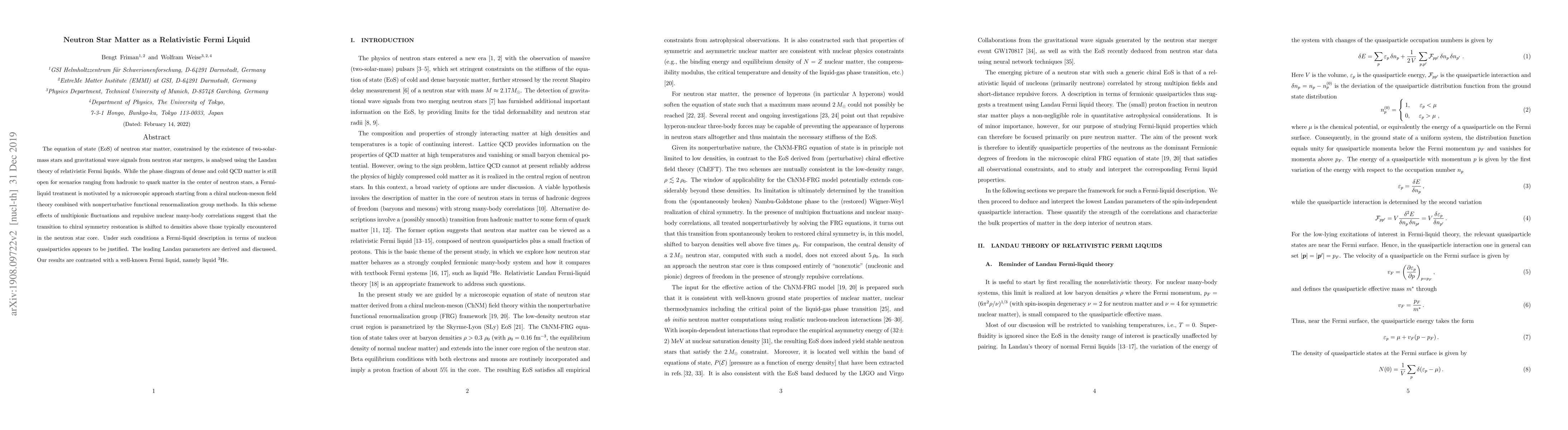 The equation of state (EoS) of neutron star matter, constrained by the existence of two-solar-mass stars and gravitational wave signals from neutron star mergers, is analysed using the Landau theory of relativistic Fermi liquids. While the phase diagram of dense and cold QCD matter is still open for scenarios ranging from hadronic to quark matter in the center of neutron stars, a Fermi-liquid treatment is motivated by a microscopic approach starting from a chiral nucleon-meson field theory combined with nonperturbative functional renormalization group methods. In this scheme effects of multipionic fluctuations and repulsive nuclear many-body correlations suggest that the transition to chiral symmetry restoration is shifted to densities above those typically encountered in the neutron star core. Under such conditions a Fermi-liquid description in terms of nucleon quasiparticles appears to be justified. The leading Landau parameters are derived and discussed. Our results are contrasted with a well-known Fermi liquid, namely liquid $^3$He.