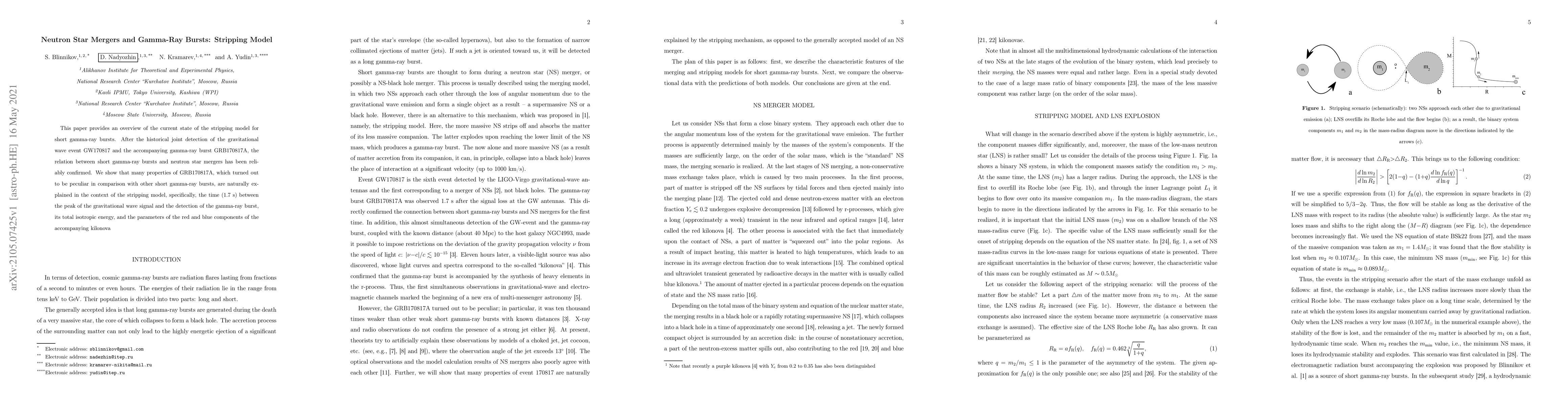 This paper provides an overview of the current state of the stripping model for short gamma-ray bursts. After the historical joint detection of the gravitational wave event GW170817 and the accompanying gamma-ray burst GRB170817A, the relation between short gamma-ray bursts and neutron star mergers has been reliably confirmed. We show that many properties of GRB170817A, which turned out to be peculiar in comparison with other short gamma-ray bursts, are naturally explained in the context of the stripping model, specifically, the time (1.7 s) between the peak of the gravitational wave signal and the detection of the gamma-ray burst, its total isotropic energy, and the parameters of the red and blue components of the accompanying kilonova.