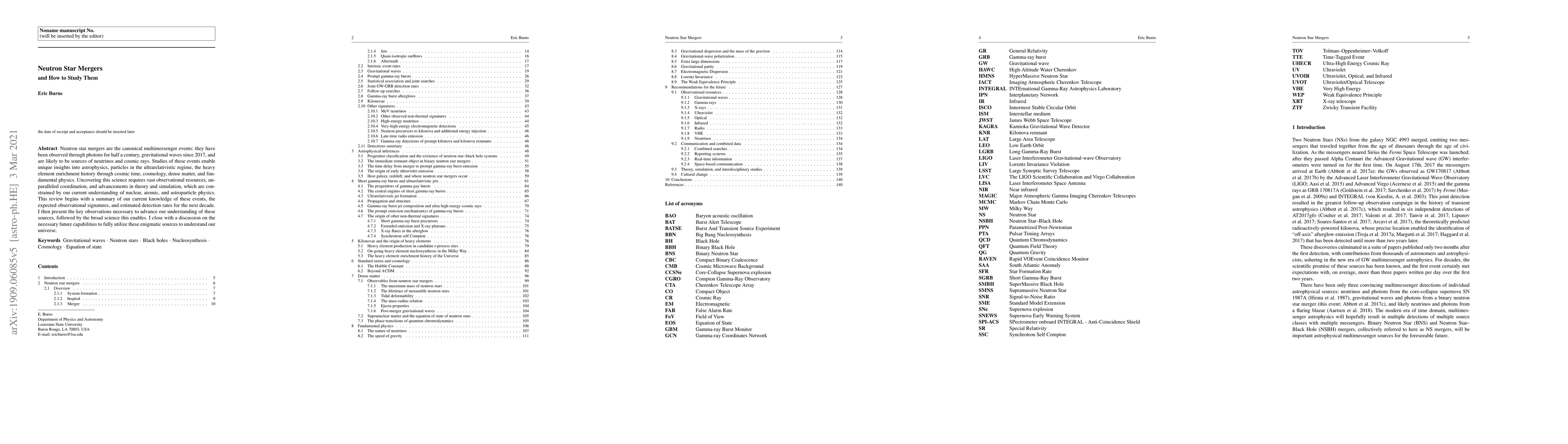 Neutron star mergers are the canonical multimessenger events: they have been observed through photons for half a century, gravitational waves since 2017, and are likely to be sources of neutrinos and cosmic rays. Studies of these events enable unique insights into astrophysics, particles in the ultrarelativistic regime, the heavy element enrichment history through cosmic time, cosmology, dense matter, and fundamental physics. Uncovering this science requires vast observational resources, unparalleled coordination, and advancements in theory and simulation, which are constrained by our current understanding of nuclear, atomic, and astroparticle physics. This review begins with a summary of our current knowledge of these events, the expected observational signatures, and estimated detection rates for the next decade. I then present the key observations necessary to advance our understanding of these sources, followed by the broad science this enables. I close with a discussion on the necessary future capabilities to fully utilize these enigmatic sources to understand our universe.