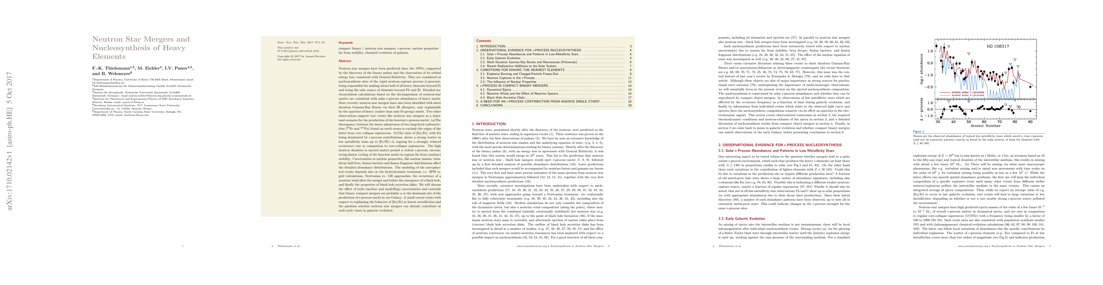 Neutron star mergers are identified as primary sites for the rapid neutron-capture process (r-process) nucleosynthesis, responsible for creating heavy elements beyond iron, and are linked to short-duration gamma-ray bursts. Uncertainties in nuclear properties and astrophysical modeling affect the resulting abundance distributions, but suggest these mergers are likely the dominant source of r-process nuclei in the Galaxy.