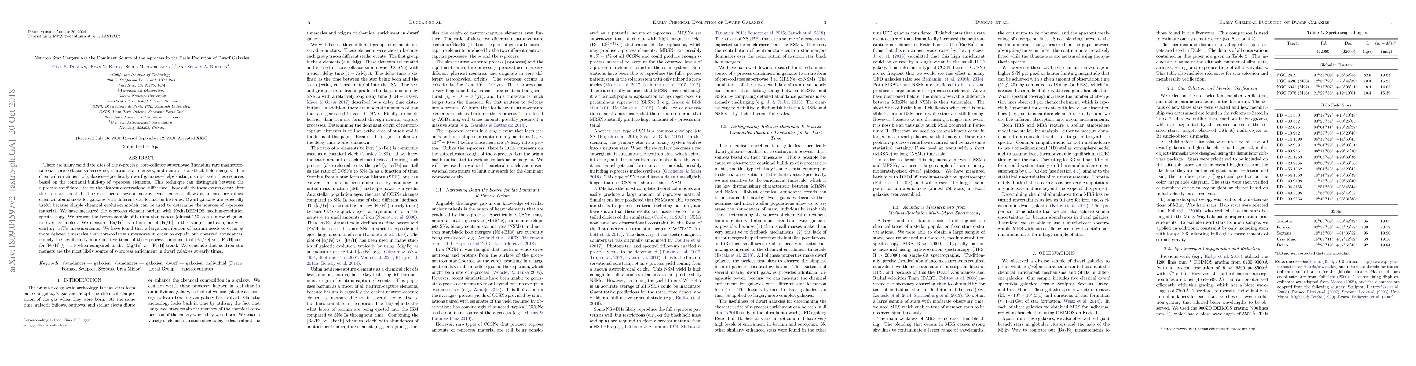 Neutron star mergers are identified as the primary source of r-process elements in the early evolution of dwarf galaxies, based on the delayed enrichment patterns observed in barium abundances compared to alpha elements. This conclusion is drawn from the largest sample of barium abundances in dwarf galaxies, revealing a significant trend that aligns with neutron star merger timescales.