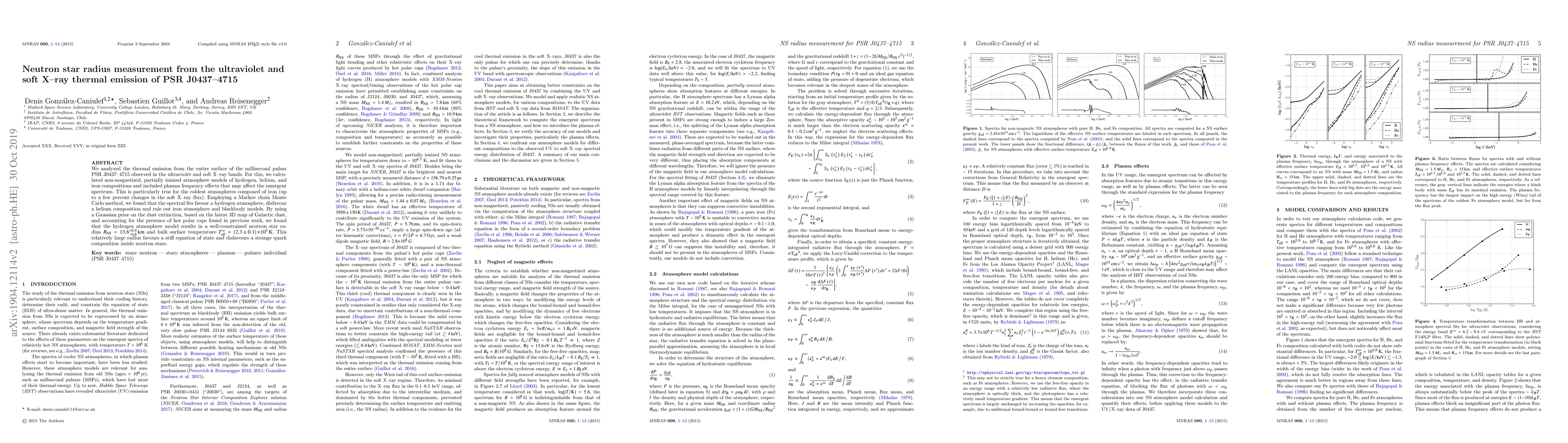 This study measures the neutron star radius of PSR J0437-4715 using ultraviolet and soft X-ray thermal emission data, finding a radius of $R_\mathrm{NS} = 13.6^{+0.9}_{-0.8}~\mathrm{km}$. The analysis favors a hydrogen atmosphere model, disfavoring helium and iron compositions, which supports a stiff equation of state for the neutron star.