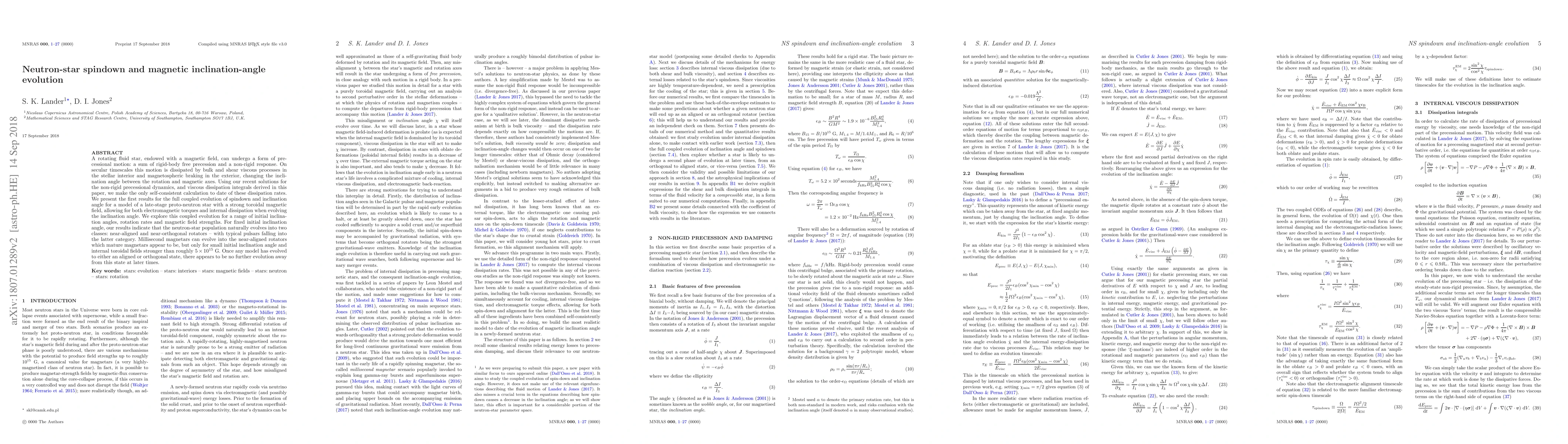 A rotating fluid star, endowed with a magnetic field, can undergo a form of precessional motion: a sum of rigid-body free precession and a non-rigid response. On secular timescales this motion is dissipated by bulk and shear viscous processes in the stellar interior and magnetospheric braking in the exterior, changing the inclination angle between the rotation and magnetic axes. Using our recent solutions for the non-rigid precessional dynamics, and viscous dissipation integrals derived in this paper, we make the only self-consistent calculation to date of these dissipation rates. We present the first results for the full coupled evolution of spindown and inclination angle for a model of a late-stage proto-neutron star with a strong toroidal magnetic field, allowing for both electromagnetic torques and internal dissipation when evolving the inclination angle. We explore this coupled evolution for a range of initial inclination angles, rotation rates and magnetic field strengths. For fixed initial inclination angle, our results indicate that the neutron-star population naturally evolves into two classes: near-aligned and near-orthogonal rotators -- with typical pulsars falling into the latter category. Millisecond magnetars can evolve into the near-aligned rotators which mature magnetars appear to be, but only for small initial inclination angle and internal toroidal fields stronger than roughly $5\times 10^{15}$ G. Once any model has evolved to either an aligned or orthogonal state, there appears to be no further evolution away from this state at later times.