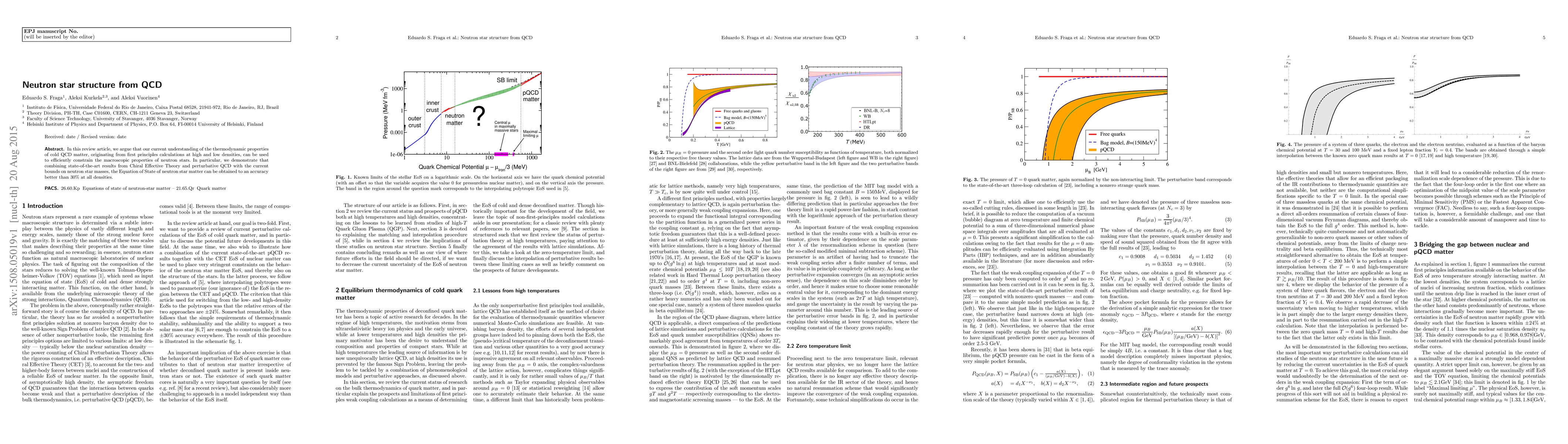 In this review article, we argue that our current understanding of the thermodynamic properties of cold QCD matter, originating from first principles calculations at high and low densities, can be used to efficiently constrain the macroscopic properties of neutron stars. In particular, we demonstrate that combining state-of-the-art results from Chiral Effective Theory and perturbative QCD with the current bounds on neutron star masses, the Equation of State of neutron star matter can be obtained to an accuracy better than 30% at all densities.