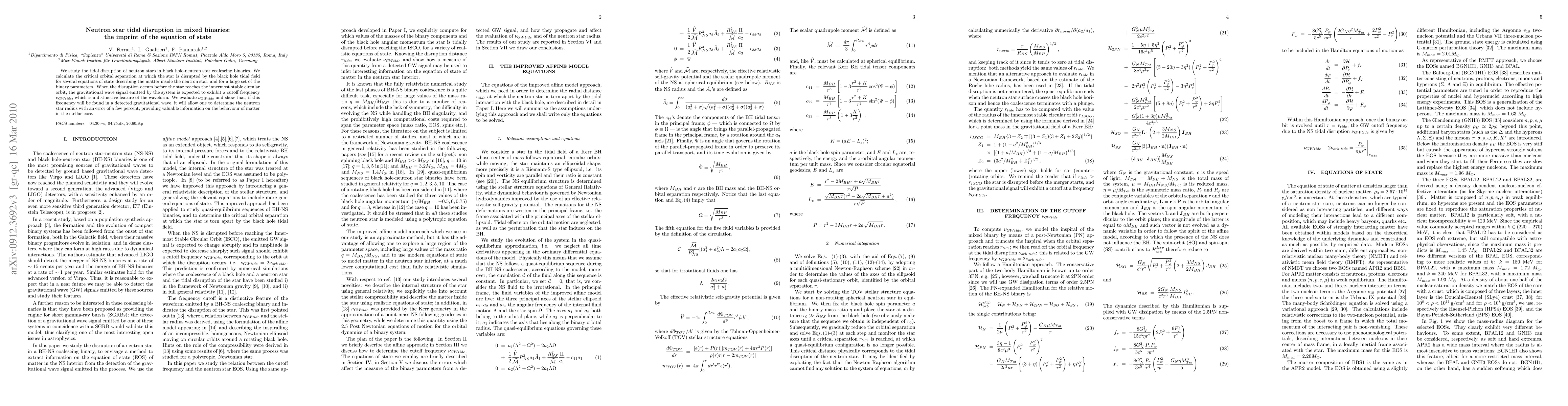 This paper investigates the tidal disruption of neutron stars in black hole-neutron star binaries, calculating the critical disruption separation for various neutron star equations of state. The study finds that a cutoff frequency in the gravitational wave signal, nu_GWtide, can reveal the neutron star radius, offering insights into the equation of state and matter behavior in the stellar core.