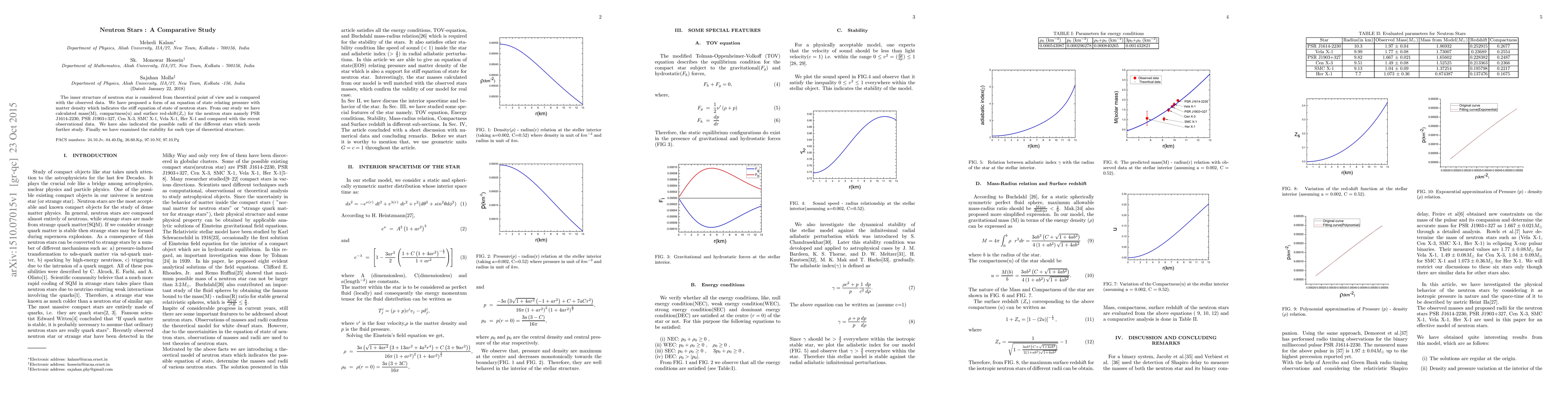 The inner structure of neutron star is considered from theoretical point of view and is compared with the observed data. We have proposed a form of an equation of state relating pressure with matter density which indicates the stiff equation of state of neutron stars. From our study we have calculated mass(M), compactness(u) and surface red-shift(Zs ) for the neutron stars namely PSR J1614-2230, PSR J1903+327, Cen X-3, SMC X-1, Vela X-1, Her X-1 and compared with the recent observational data. We have also indicated the possible radii of the different stars which needs further study. Finally we have examined the stability for such type of theoretical structure.