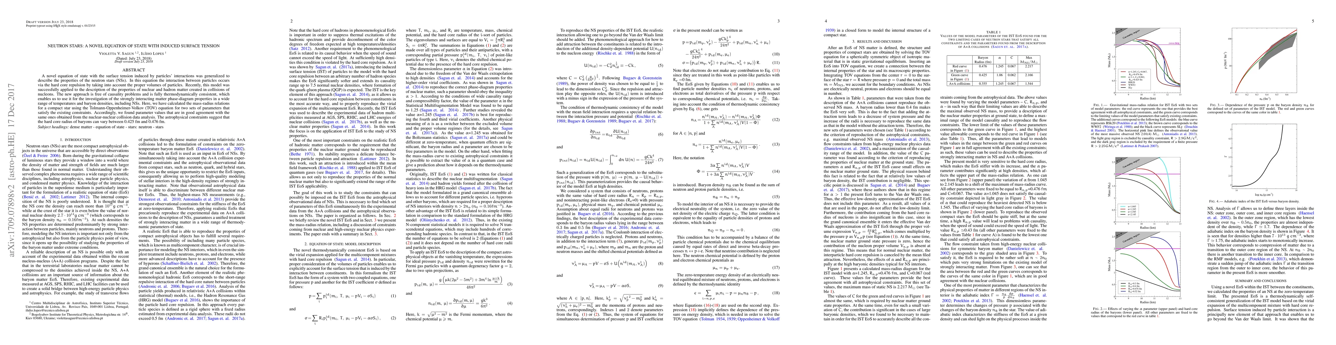 A novel equation of state with the surface tension induced by particles' interactions was generalized to describe the properties of the neutron stars (NSs). In this equation the interaction between particles occurs via the hard core repulsion by taking into account the proper volumes of particles. Recently, this model was successfully applied to the description of the properties of nuclear and hadron matter created in collisions of nucleons. The new approach is free of causality problems and is fully thermodynamically consistent, which enables us to use it for the investigation of the strongly interacting matter phase-diagram properties in a wide range of temperatures and baryon densities, including NSs. Here, we have calculated the mass-radius relations for a compact star using the Tolmann-Oppenheimer-Volkov (TOV) equation for two sets of parameters that satisfy the existing constraints. Accordingly, we found parameter values that are in good agreement with the same ones obtained from the nuclear-nuclear collision data analysis. The astrophysical constraints suggest that the hard core radius of baryons can vary between 0.425 fm and 0.476 fm.