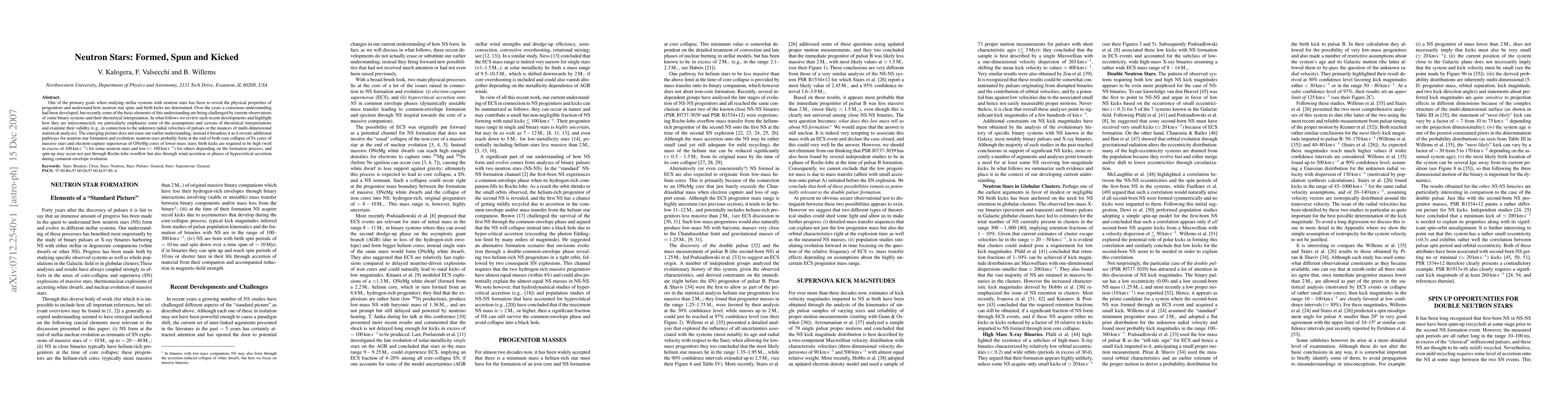 One of the primary goals when studying stellar systems with neutron stars has been to reveal the physical properties of progenitors and understand how neutron star spins and birth kicks are determined. Over the years a consensus understanding had been developed, but recently some of the basic elements of this understanding are being challenged by current observations of some binary systems and their theoretical interpretation. In what follows we review such recent developments and highlight how they are interconnected; we particularly emphasize some of the assumptions and caveats of theoretical interpretations and examine their validity (e.g., in connection to the unknown radial velocities of pulsars or the nuances of multi-dimensional statistical analysis). The emerging picture does not erase our earlier understanding; instead it broadens it as it reveals additional pathways for neutron star formation and evolution: neutron stars probably form at the end of both core collapse of Fe cores of massive stars and electron-capture supernovae of ONeMg cores of lower-mass stars; birth kicks are required to be high (well in excess of 100 km/s) for some neutron stars and low (< 100 km/s) for others depending on the formation process; and spin up may occur not just through Roche-lobe overflow but also through wind accretion or phases of hypercritical accretion during common envelope evolution.