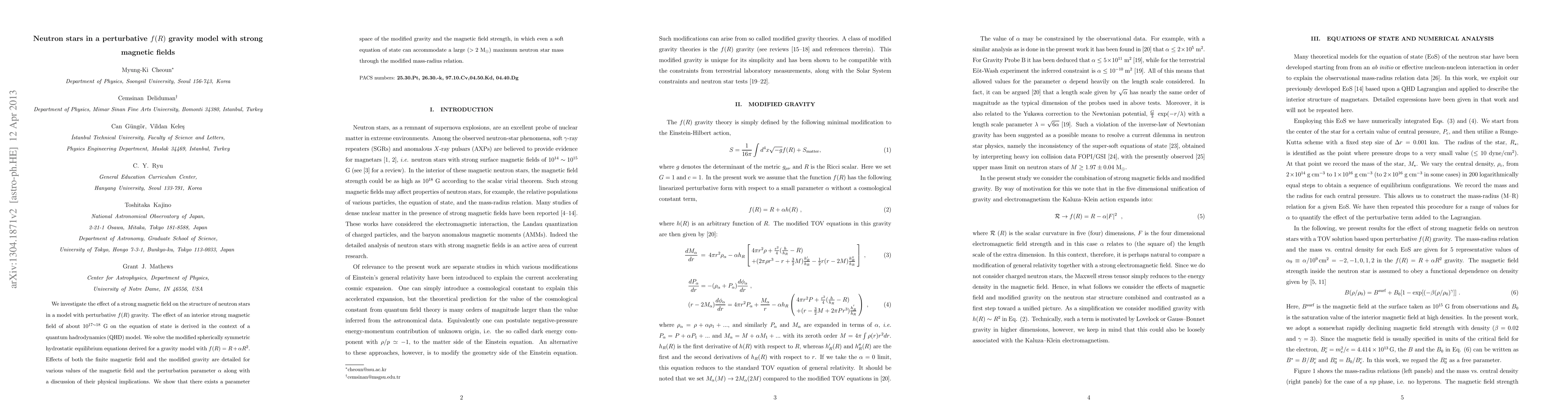 We investigate the effect of a strong magnetic field on the structure of neutron stars in a model with perturbative $f(R)$ gravity. The effect of an interior strong magnetic field of about $10^{17 \sim 18}$ G on the equation of state is derived in the context of a quantum hadrodynamics (QHD) model. We solve the modified spherically symmetric hydrostatic equilibrium equations derived for a gravity model with $f(R)=R+\alpha R^2$. Effects of both the finite magnetic field and the modified gravity are detailed for various values of the magnetic field and the perturbation parameter $\alpha$ along with a discussion of their physical implications. We show that there exists a parameter space of the modified gravity and the magnetic field strength, in which even a soft equation of state can accommodate a large ($> 2$ M$_\odot$) maximum neutron star mass through the modified mass-radius relation.