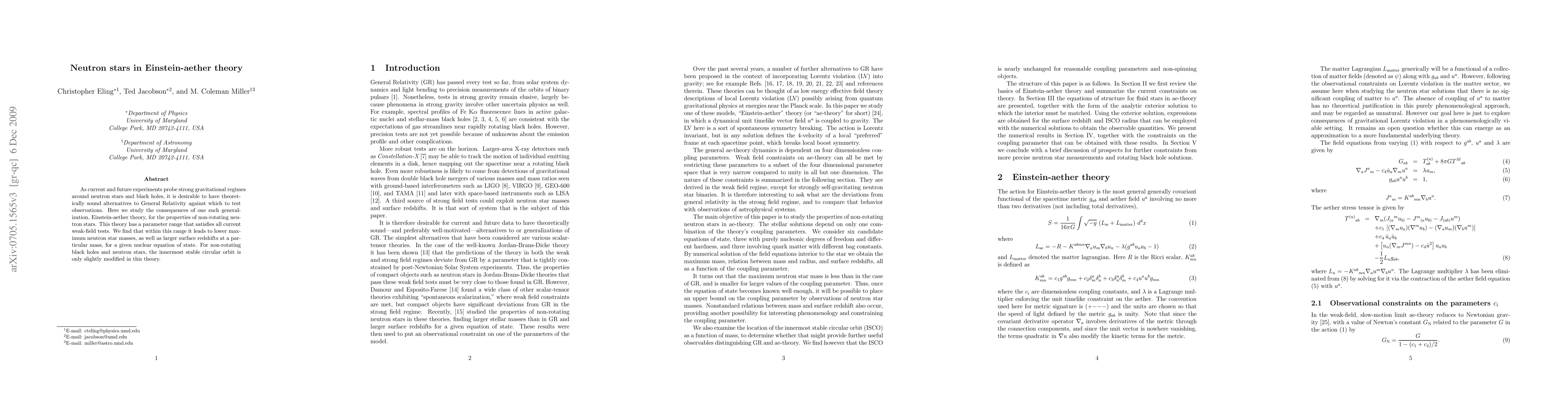 This paper examines the implications of Einstein-aether theory for non-rotating neutron stars, finding that it results in lower maximum masses and larger surface redshifts compared to general relativity, while minimally affecting the innermost stable circular orbits. This theoretical framework provides an alternative to general relativity for testing observations in strong gravitational fields.