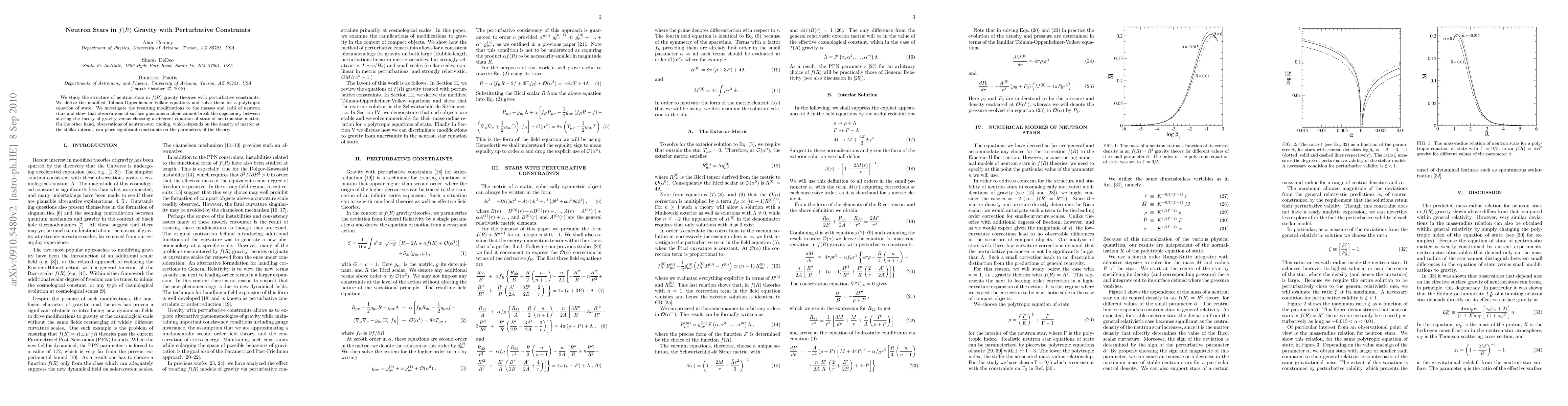 We study the structure of neutron stars in f(R) gravity theories with perturbative constraints. We derive the modified Tolman-Oppenheimer-Volkov equations and solve them for a polytropic equation of state. We investigate the resulting modifications to the masses and radii of neutron stars and show that observations of surface phenomena alone cannot break the degeneracy between altering the theory of gravity versus choosing a different equation of state of neutron-star matter. On the other hand, observations of neutron-star cooling, which depends on the density of matter at the stellar interior, can place significant constraints on the parameters of the theory.