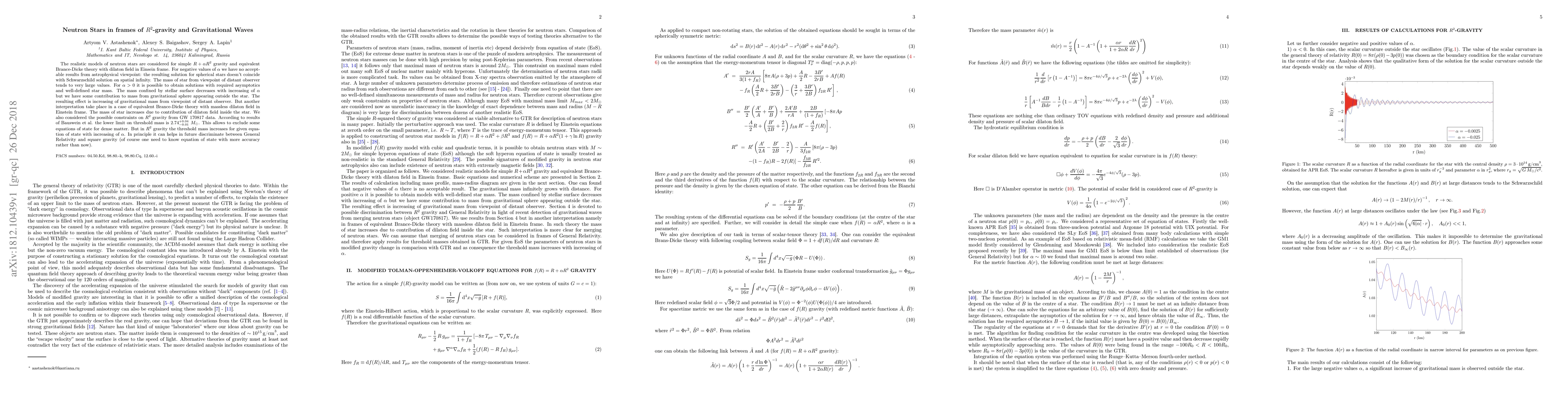 This paper explores neutron stars in $R^2$-gravity and gravitational waves, finding that for positive values of $eta$, star mass decreases with increasing $eta$ but is increased by a dilaton field in Brance-Dicke theory; the threshold mass limit from GW 170817 data helps exclude some equations of state for dense matter.
