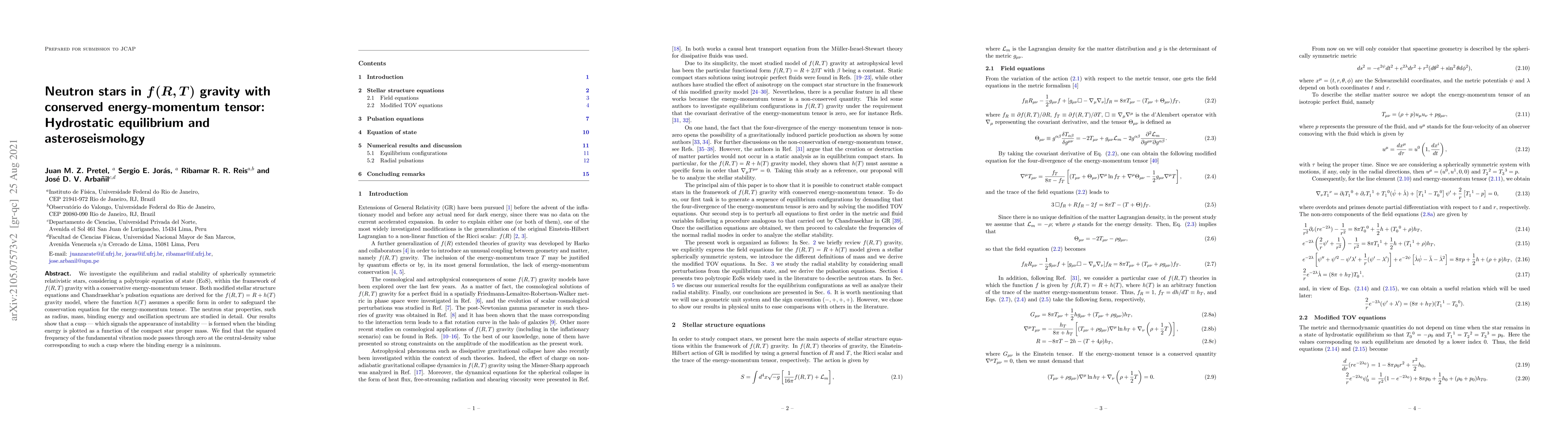 We investigate the equilibrium and radial stability of spherically symmetric relativistic stars, considering a polytropic equation of state (EoS), within the framework of $f(R,T)$ gravity with a conservative energy-momentum tensor. Both modified stellar structure equations and Chandrasekhar's pulsation equations are derived for the $f(R,T)= R+ h(T)$ gravity model, where the function $h(T)$ assumes a specific form in order to safeguard the conservation equation for the energy-momentum tensor. The neutron star properties, such as radius, mass, binding energy and oscillation spectrum are studied in detail. Our results show that a cusp -- which signals the appearance of instability -- is formed when the binding energy is plotted as a function of the compact star proper mass. We find that the squared frequency of the fundamental vibration mode passes through zero at the central-density value corresponding to such a cusp where the binding energy is a minimum.