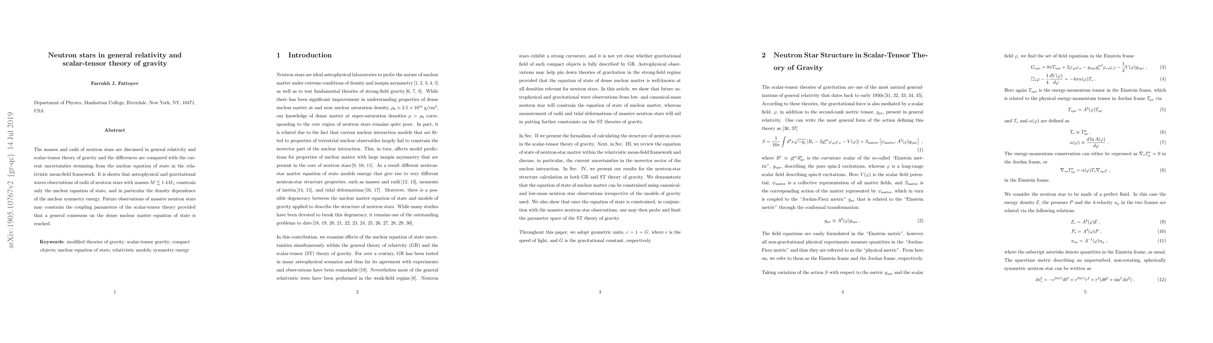 This paper explores the masses and radii of neutron stars under general relativity and scalar-tensor gravity, comparing the differences with uncertainties from the nuclear equation of state. Current observations of neutron star radii constrain the nuclear symmetry energy, while future observations of massive neutron stars could potentially constrain scalar-tensor theory parameters if nuclear matter consensus is achieved.