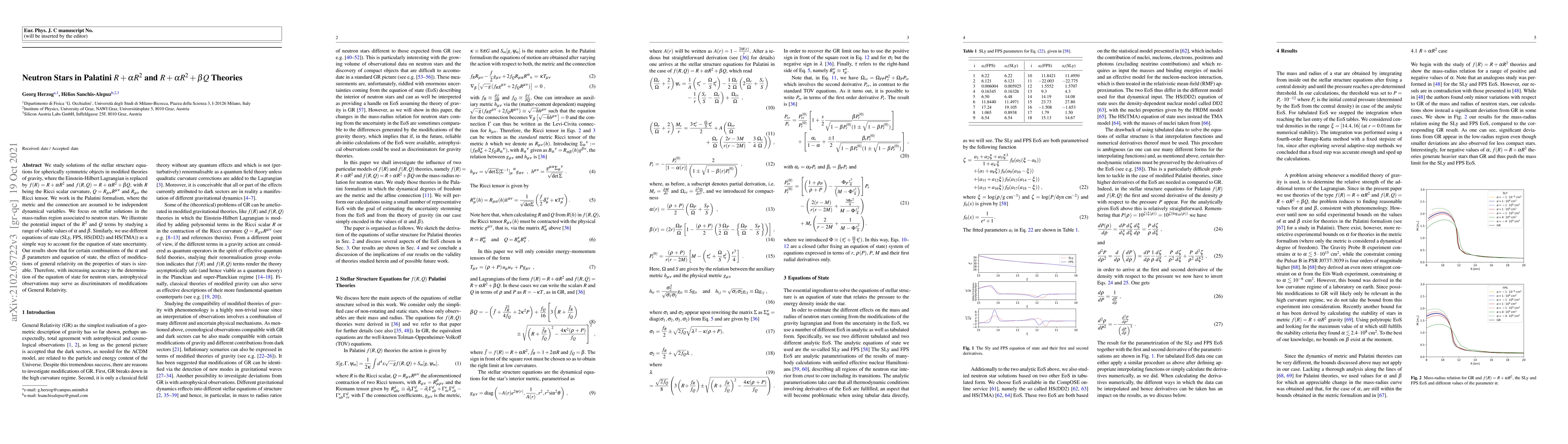 We study solutions of the stellar structure equations for spherically symmetric objects in Palatini $f(R)=R+\alpha R^2$ and $f(R,Q)=R+\alpha R^2+\beta Q$ in the mass-radius region associated to neutron stars. We illustrate the potential impact of the $R^2$ and $Q$ terms by studying a range of viable values of $\alpha$ and $\beta$. Similarly, we use different equations of state (SLy, FPS, HS(DD2) and HS(TMA)) as a simple way to account for the equation of state uncertainty. Our results show that for certain combinations of the $\alpha$ and $\beta$ parameters and equation of state, the effect of modifications of general relativity on the properties of stars is sizeable. Therefore, with increasing accuracy in the determination of the equation of state for neutron stars, astrophysical observations may serve as discriminators of modifications of General Relativity.