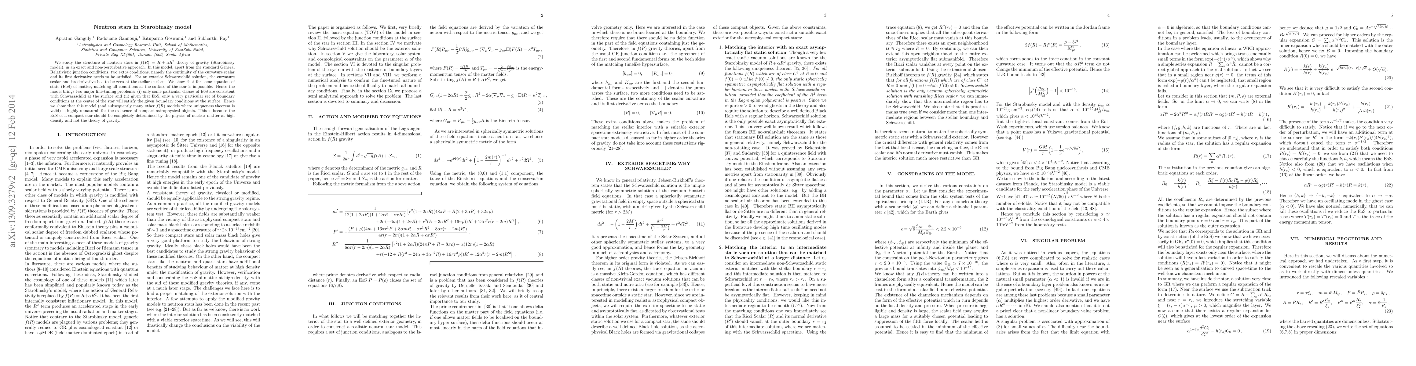 We study the structure of neutron stars in $f(R)=R+\alpha R^{2}$ theory of gravity (Starobinsky model), in an exact and non-perturbative approach. In this model, apart from the standard General Relativistic junction conditions, two extra conditions, namely the continuity of the curvature scalar and its first derivative needs to be satisfied. For an exterior Schwarzschild solution, the curvature scalar and its derivative has to be zero at the stellar surface. We show that for some equation of state (EoS) of matter, matching all conditions at the surface of the star is impossible. Hence the model brings two major fine-tuning problems: (i) only some particular classes of EoS are consistent with Schwarzschild at the surface and (ii) given that EoS, only a very particular set of boundary conditions at the centre of the star will satisfy the given boundary conditions at the surface. Hence we show that this model (and subsequently many other f(R) models where uniqueness theorem is valid) is highly unnatural, for the existence of compact astrophysical objects. This is because the EoS of a compact star should be completely determined by the physics of nuclear matter at high density and not the theory of gravity.