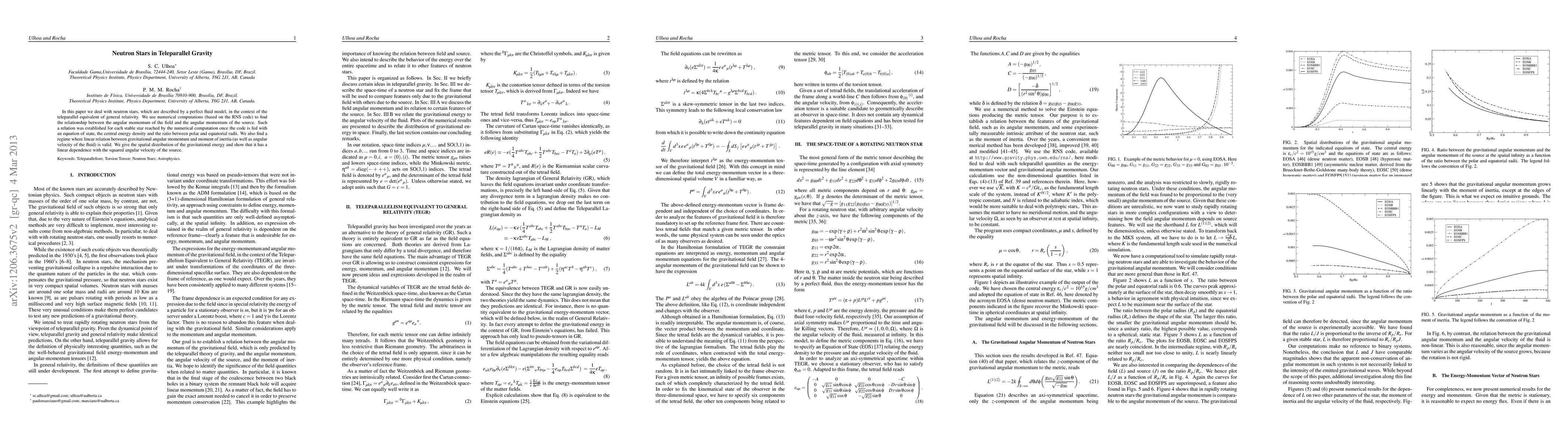 In this paper we deal with neutron stars, which are described by a perfect fluid model, in the context of the teleparallel equivalent of general relativity. We use numerical simulations to find the relationship between the angular momentum of the field and the angular momentum of the source. Such a relation was established for each stable star reached by the numerical simulation once the code is fed with an equation of state, the central energy density and the ratio between polar and equatorial radii. We also find a regime where linear relation between gravitational angular momentum and moment of inertia (as well as angular velocity of the fluid) is valid. We give the spatial distribution of the gravitational energy and show that it has a linear dependence with the squared angular velocity of the source.