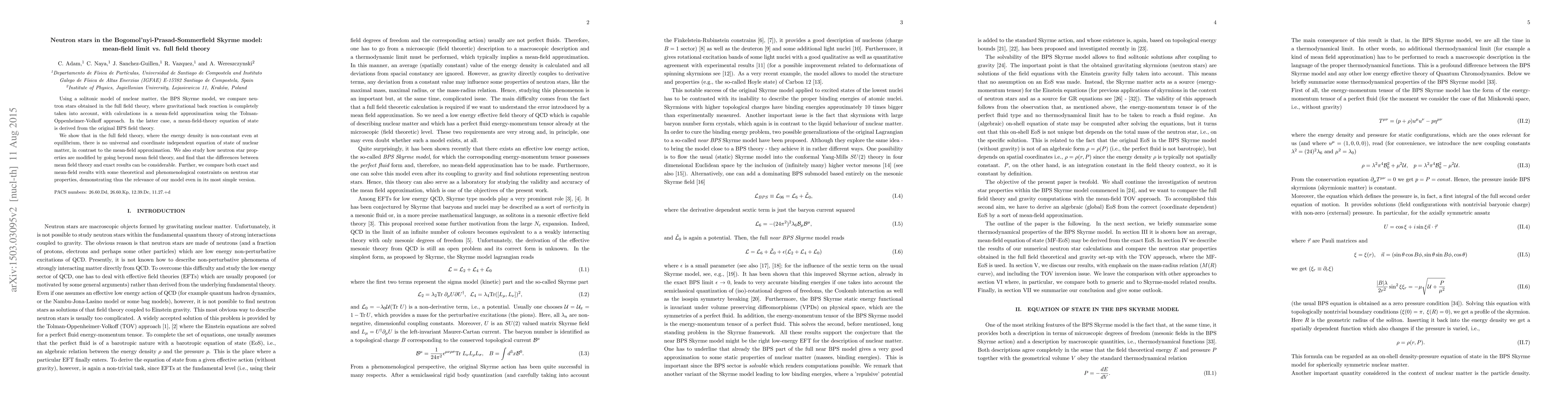 This paper compares neutron star properties obtained from a BPS Skyrme model in full field theory to those calculated using a mean-field approximation, highlighting significant differences between the two methods.