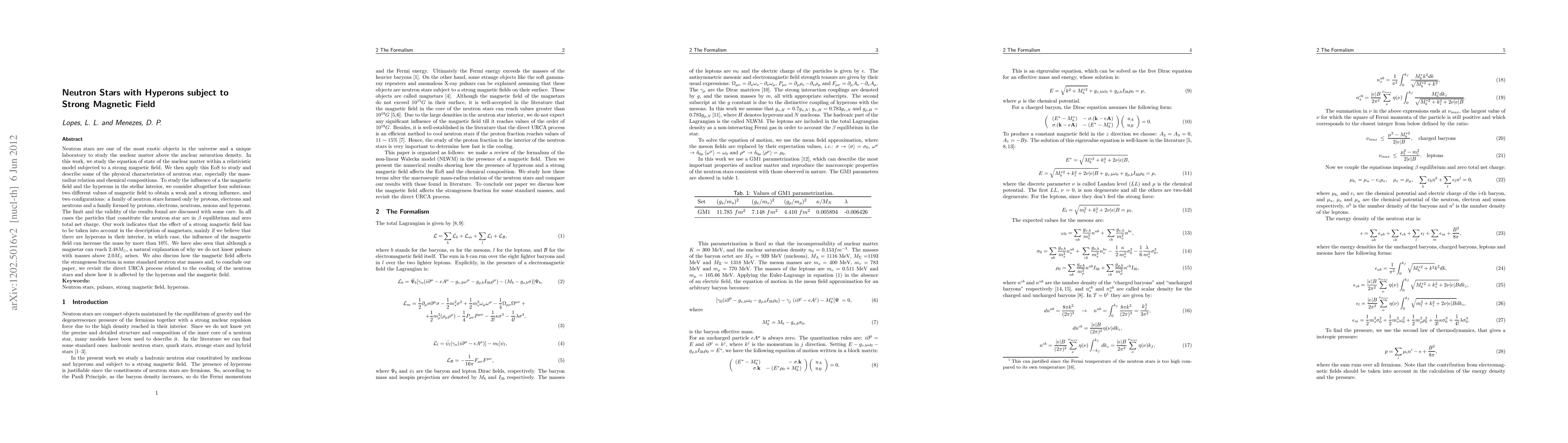 This research investigates neutron stars with hyperons under strong magnetic fields, finding that such fields and hyperon presence can increase a magnetar's mass by over 10%. The study also explains why we observe fewer pulsars with masses above 2.0$M_{odot}$, and explores the impact of magnetic fields on strangeness fraction and the direct Urca process affecting neutron star cooling.