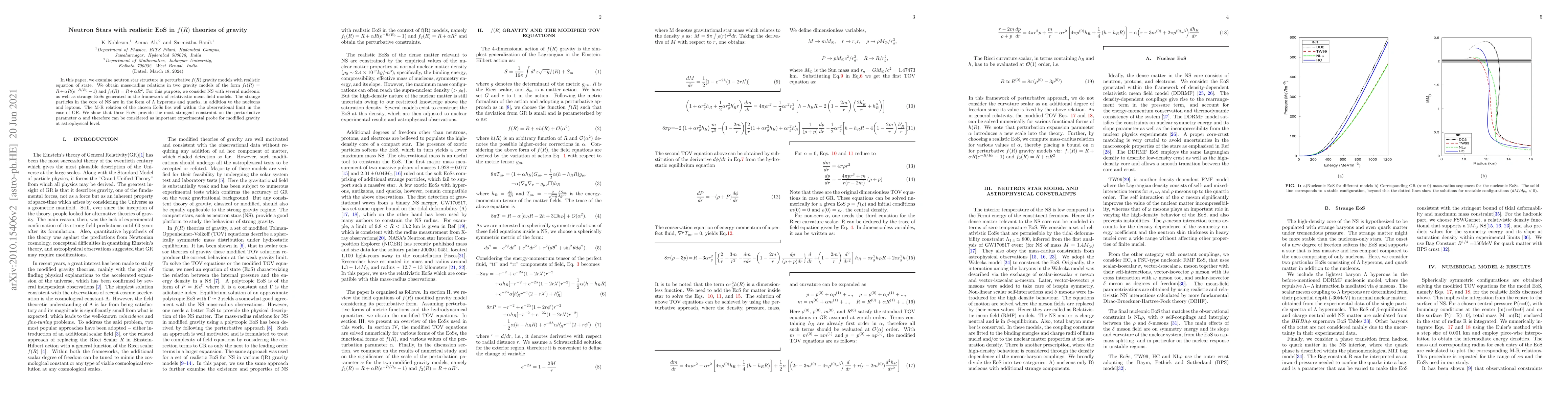 This paper investigates neutron star structures in $f(R)$ gravity models using realistic equations of state (EoS), including nucleonic and strange matter. It finds that certain EoSs provide stringent constraints on the perturbative parameter $\alpha$, serving as significant probes for modified gravity theories.