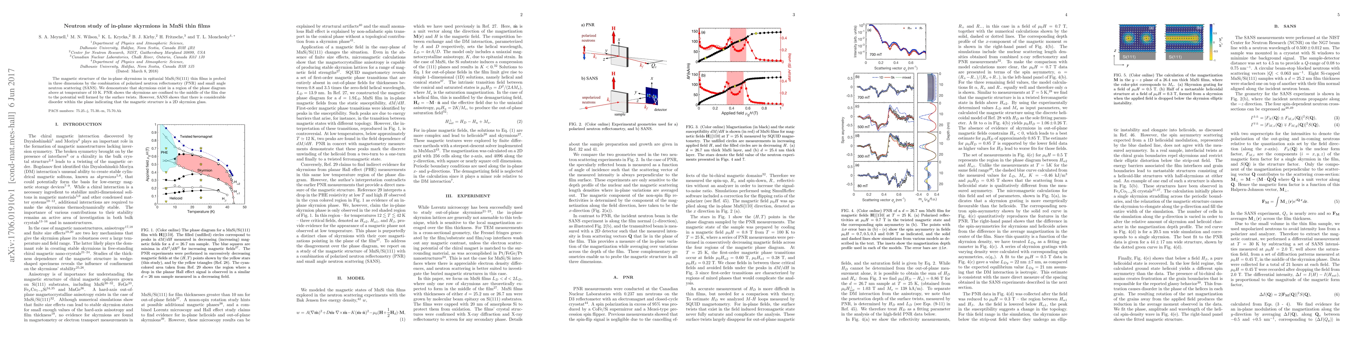 This study employs polarized neutron reflectometry and small angle neutron scattering to investigate in-plane skyrmions in MnSi thin films, confirming their existence above 10 K. While skyrmions are confined to the film's middle by surface twists, the magnetic structure exhibits considerable planar disorder, suggesting a 2D skyrmion glass state.