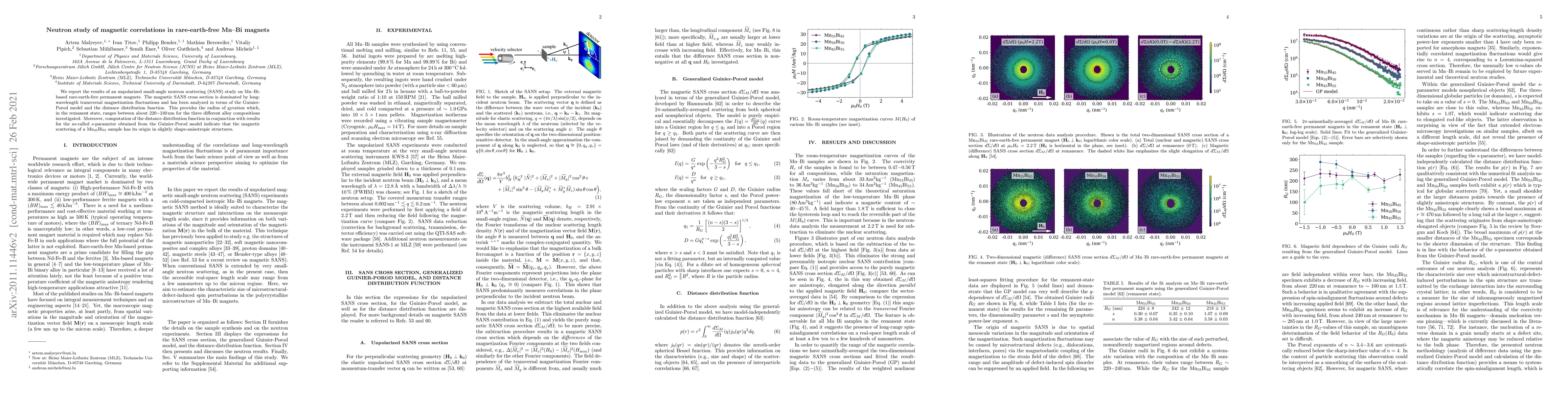 We report the results of an unpolarized small-angle neutron scattering (SANS) study on Mn-Bi-based rare-earth-free permanent magnets. The magnetic SANS cross section is dominated by long-wavelength transversal magnetization fluctuations and has been analyzed in terms of the Guinier-Porod model and the distance distribution function. This provides the radius of gyration which, in the remanent state, ranges between about $220-240 \, \mathrm{nm}$ for the three different alloy compositions investigated. Moreover, computation of the distance distribution function in conjunction with results for the so-called $s$-parameter obtained from the Guinier-Porod model indicate that the magnetic scattering of a Mn$_{45}$Bi$_{55}$ sample has its origin in slightly shape-anisotropic structures.