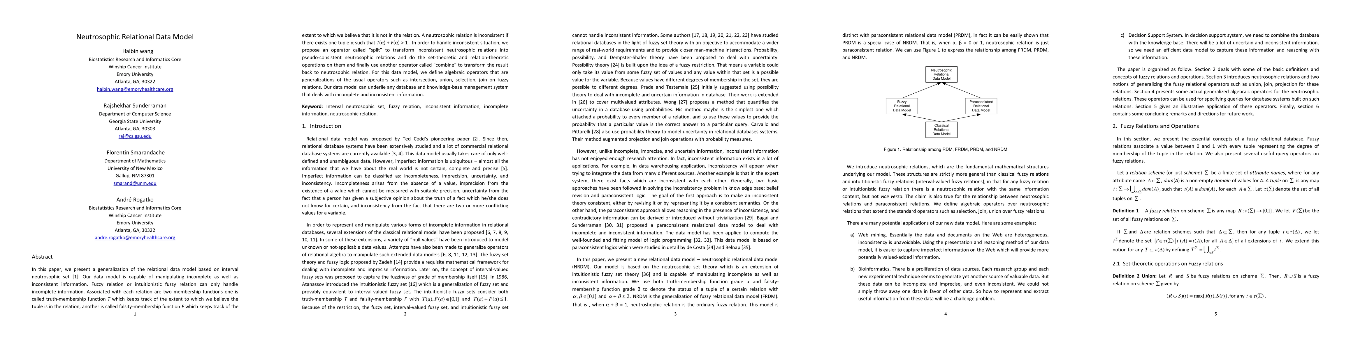 This paper proposes a data model that can handle incomplete and inconsistent information using neutrosophic relations, which include two membership functions to track truth and falsity memberships. The model provides operators to transform inconsistent relations into pseudo-consistent ones and perform set-theoretic and relation-theoretic operations.