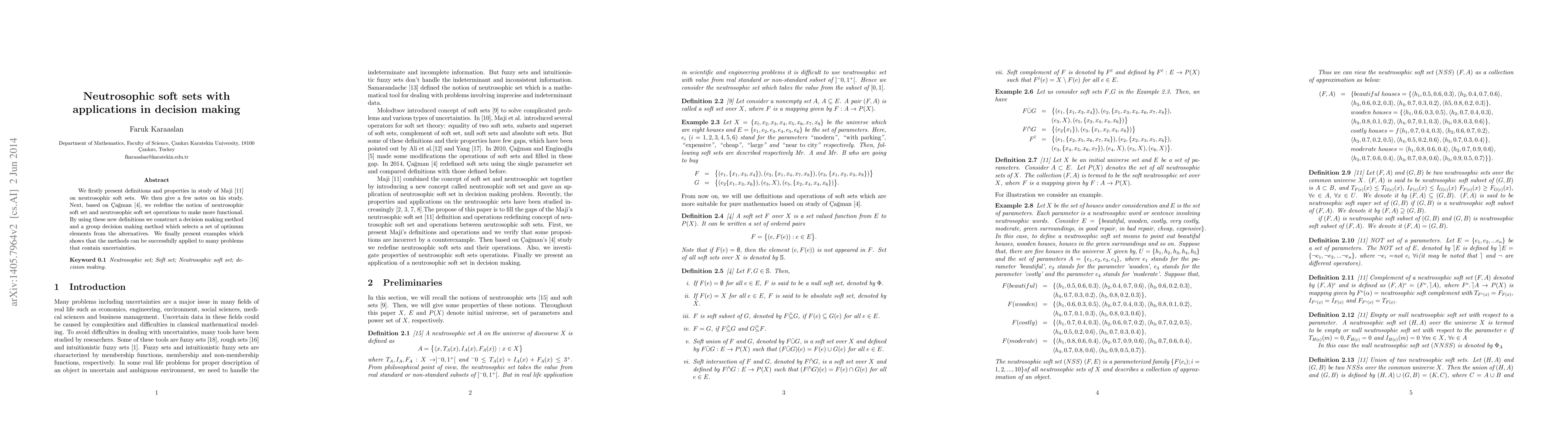 We firstly present definitions and properties in study of Maji \cite{maji-2013} on neutrosophic soft sets. We then give a few notes on his study. Next, based on \c{C}a\u{g}man \cite{cagman-2014}, we redefine the notion of neutrosophic soft set and neutrosophic soft set operations to make more functional. By using these new definitions we construct a decision making method and a group decision making method which selects a set of optimum elements from the alternatives. We finally present examples which shows that the methods can be successfully applied to many problems that contain uncertainties.