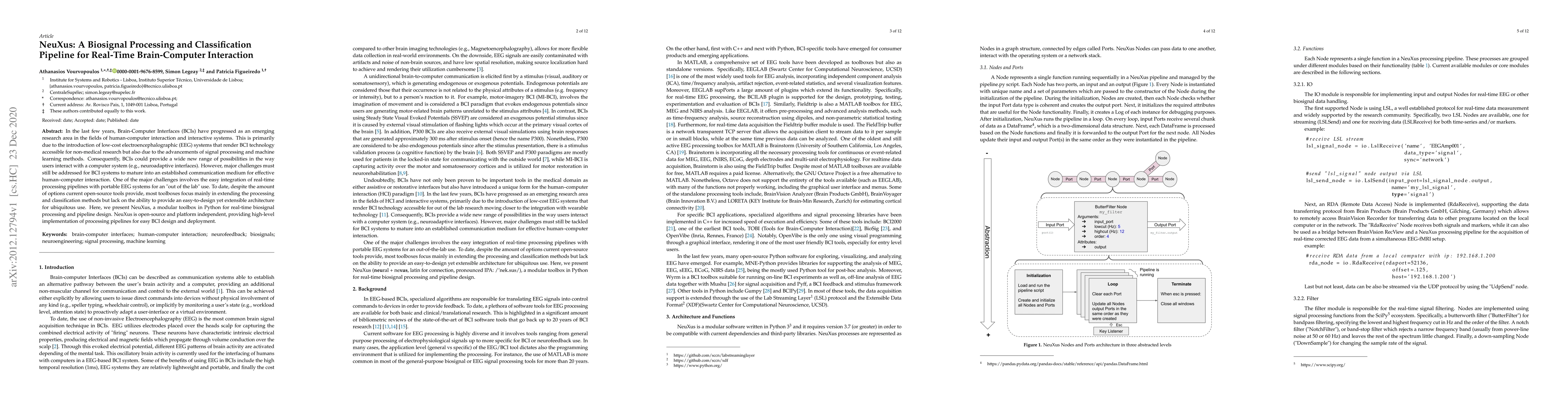 NeuXus is an open-source, modular Python toolbox designed for real-time biosignal processing and classification, aimed at facilitating the integration of brain-computer interfaces (BCIs) into everyday use. It addresses the need for an extensible architecture for portable EEG systems, enhancing the usability of BCI technology beyond laboratory settings.