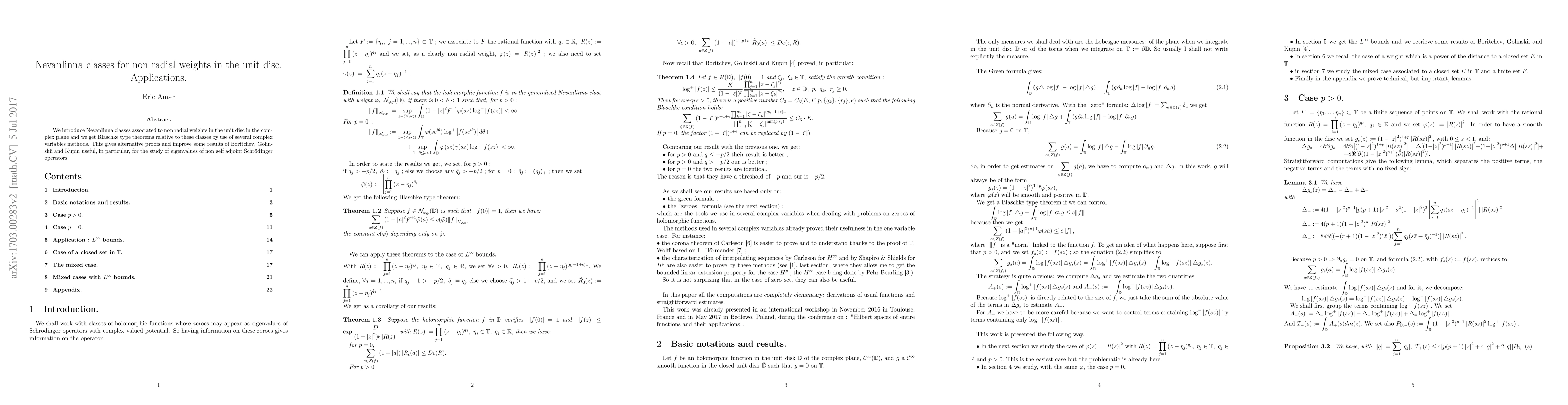 We introduce Nevanlinna classes associated to non radial weights in the unit disc in the complex plane and we get Blaschke type theorems relative to these classes by use of several complex variables methods. This gives alternative proofs and improve some results of Boritchev, Golinski and Kupin useful, in particular, for the study of eigenvalues of non self adjoint Schr\"odinger operators.