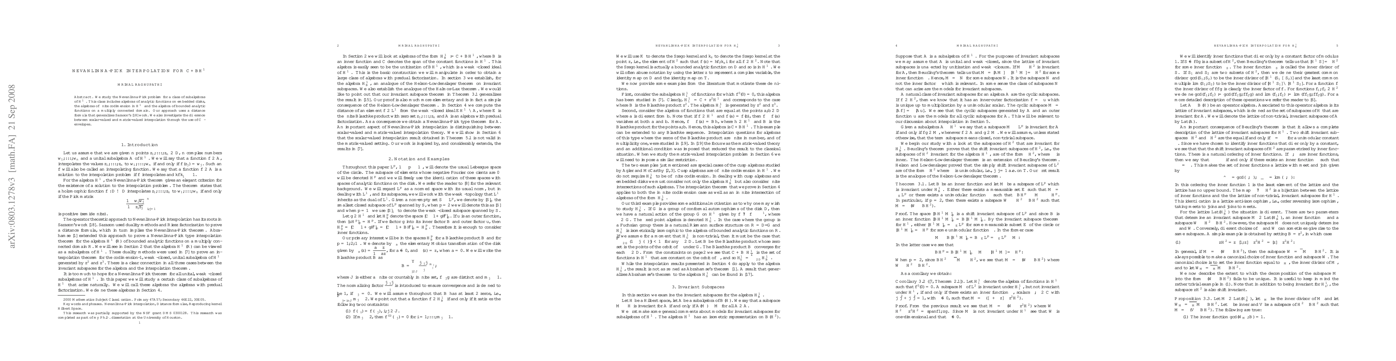 This paper classifies invariant subspaces of the algebra $H^\infty_B$ and derives a formula for the distance of elements in $L^\infty$ to a weak*-closed ideal, establishing an analogue of the Nevanlinna-Pick interpolation theorem for this setting.