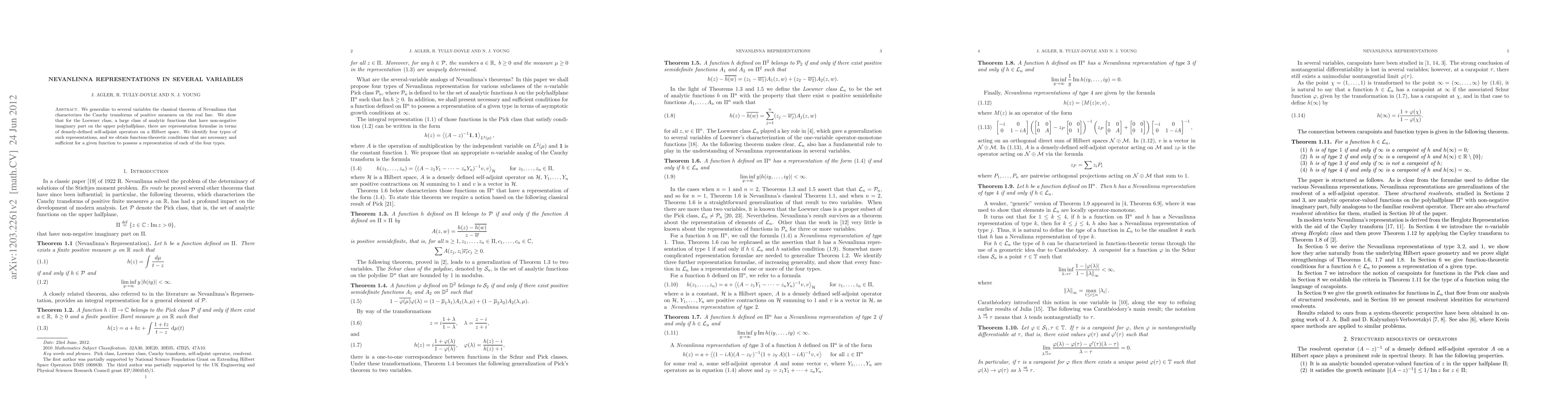 This paper generalizes Nevanlinna's integral representation formulae for functions of several variables, showing that analytic functions with non-negative imaginary parts on the upper polyhalfplane can be represented using self-adjoint operators on a Hilbert space. It identifies three structured resolvents and four representation types, linking these representations to the function's growth behavior.