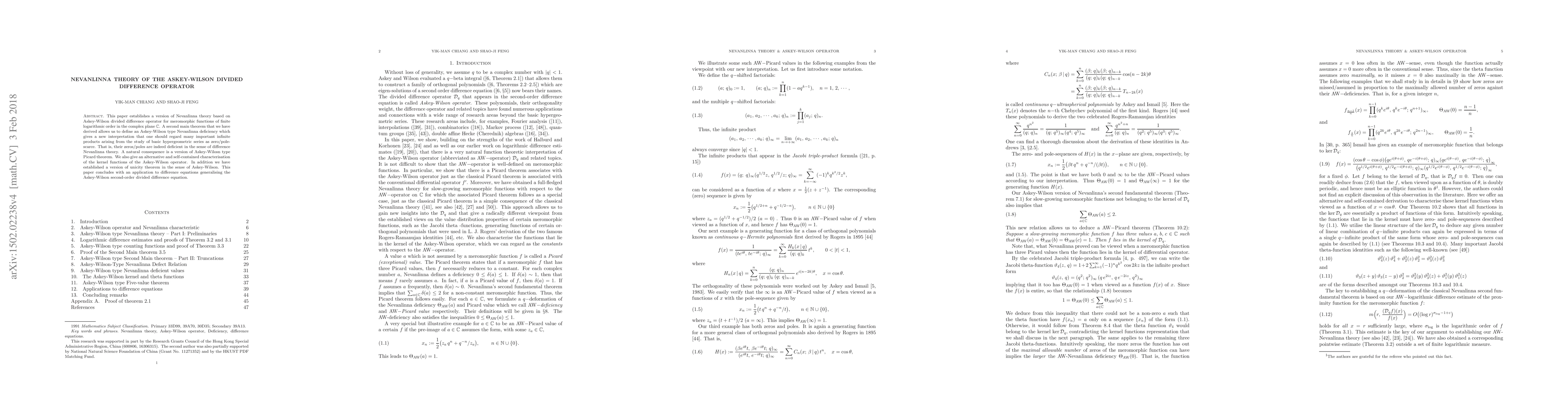 This paper establishes a version of Nevanlinna theory based on Askey-Wilson divided difference operator for meromorphic functions of finite logarithmic order in the complex plane $\mathbb{C}$. A second main theorem that we have derived allows us to define an Askey-Wilson type Nevanlinna deficiency which gives a new interpretation that one should regard many important infinite products arising from the study of basic hypergeometric series as zero/pole-scarce. That is, their zeros/poles are indeed deficient in the sense of difference Nevanlinna theory. A natural consequence is a version of Askey-Wilosn type Picard theorem. We also give an alternative and self-contained characterisation of the kernel functions of the Askey-Wilson operator. In addition we have established a version of unicity theorem in the sense of Askey-Wilson. This paper concludes with an application to difference equations generalising the Askey-Wilson second-order divided difference equation.
