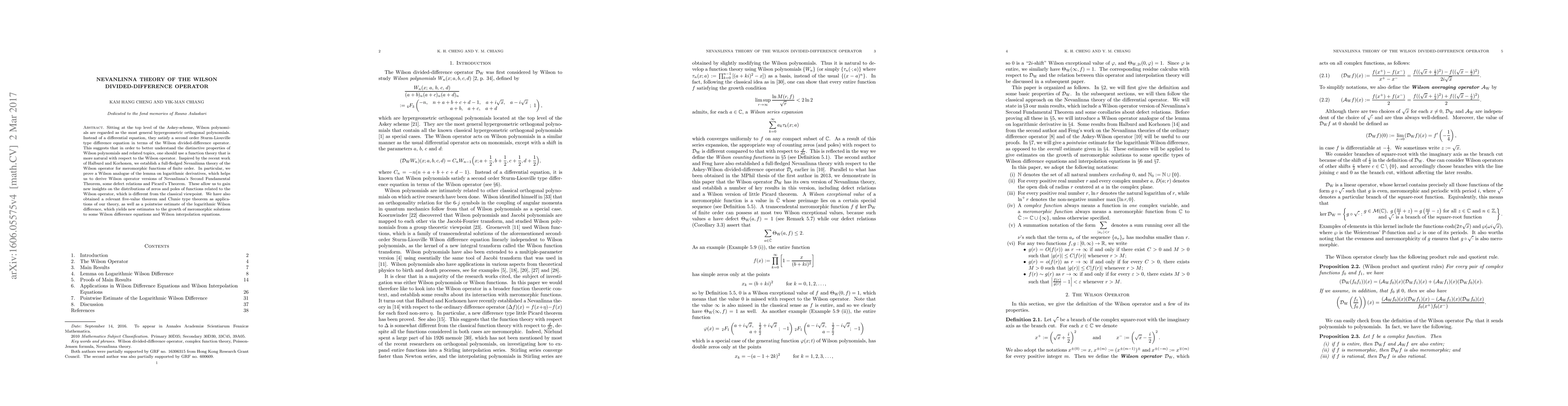 Sitting at the top level of the Askey-scheme, Wilson polynomials are regarded as the most general hypergeometric orthogonal polynomials. Instead of a differential equation, they satisfy a second order Sturm-Liouville type difference equation in terms of the Wilson divided-difference operator. This suggests that in order to better understand the distinctive properties of Wilson polynomials and related topics, one should use a function theory that is more natural with respect to the Wilson operator. Inspired by the recent work of Halburd and Korhonen, we establish a full-fledged Nevanlinna theory of the Wilson operator for meromorphic functions of finite order. In particular, we prove a Wilson analogue of the lemma on logarithmic derivatives, which helps us to derive Wilson operator versions of Nevanlinna's Second Fundamental Theorem, some defect relations and Picard's Theorem. These allow us to gain new insights on the distributions of zeros and poles of functions related to the Wilson operator, which is different from the classical viewpoint. We have also obtained a relevant five-value theorem and Clunie type theorem as applications of our theory, as well as a pointwise estimate of the logarithmic Wilson difference, which yields new estimates to the growth of meromorphic solutions to some Wilson difference equations and Wilson interpolation equations.