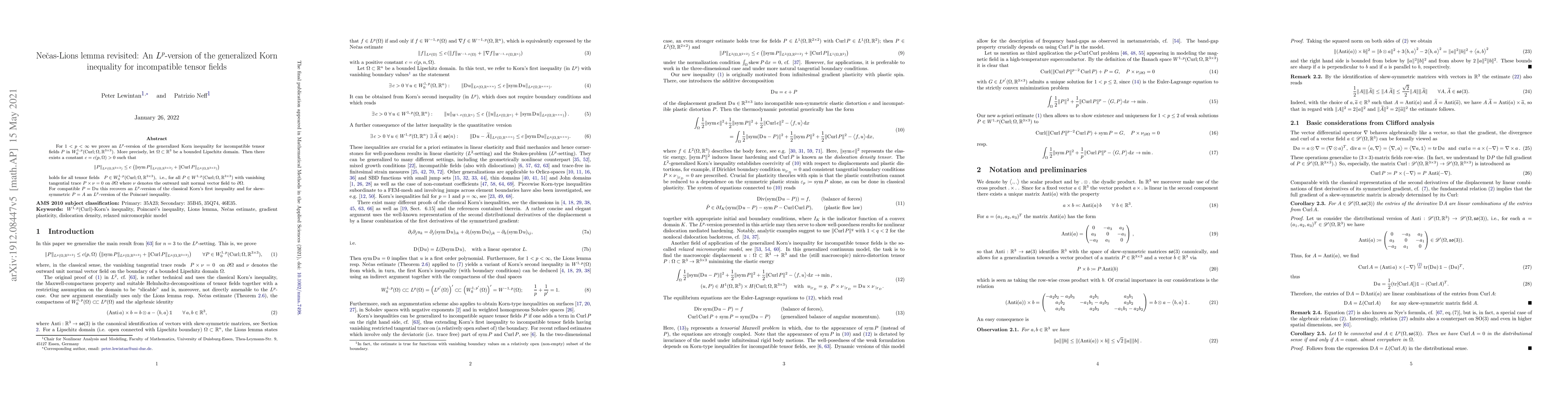 0$ such that \begin{equation*} \| P\|_{L^p(\Omega,\mathbb{R}^{3\times3})}\leq c\,\left( \|\operatorname{sym} P\|_{L^p(\Omega,\mathbb{R}^{3\times3})} + \| \operatorname{Curl}P \|_{L^p(\Omega, \mathbb{R}^{3\times3})}\right)\end{equation*} holds for all tensor fields $P\in W^{1,\,p}_0(\operatorname{Curl}; \Omega,\mathbb{R}^{3\times3})$, i.e., for all $P\in W^{1,\,p}(\operatorname{Curl}; \Omega,\mathbb{R}^{3\times3})$ with vanishing tangential trace $ P\times \nu=0 $ on $ \partial\Omega$ where $\nu$ denotes the outward unit normal vector field to $\partial\Omega$. For compatible $P=D u$ this recovers an $L^p$-version of the classical Korn's first inequality $$ \|D u \|_{L^p(\Omega,\mathbb{R}^{3\times 3})} \le c\, \|\operatorname{sym}D u\|_{L^p(\Omega,\mathbb{R}^{3\times3})} \quad \text{with }D u \times \nu = 0 \quad \text{on $\partial \Omega$}, $$ and for skew-symmetric $P=A\in\mathfrak{so}(3)$ an $L^p$-version of the Poincar\'{e} inequality $$ \|A\|_{L^p(\Omega,\mathfrak{so}(3))}\le c\, \|\operatorname{Curl} A\|_{L^p(\Omega,\mathbb{R}^{3\times3})} \quad \text{with } A \times \nu = 0 \ \Leftrightarrow \ A=0 \quad \text{on $\partial \Omega$}. $$