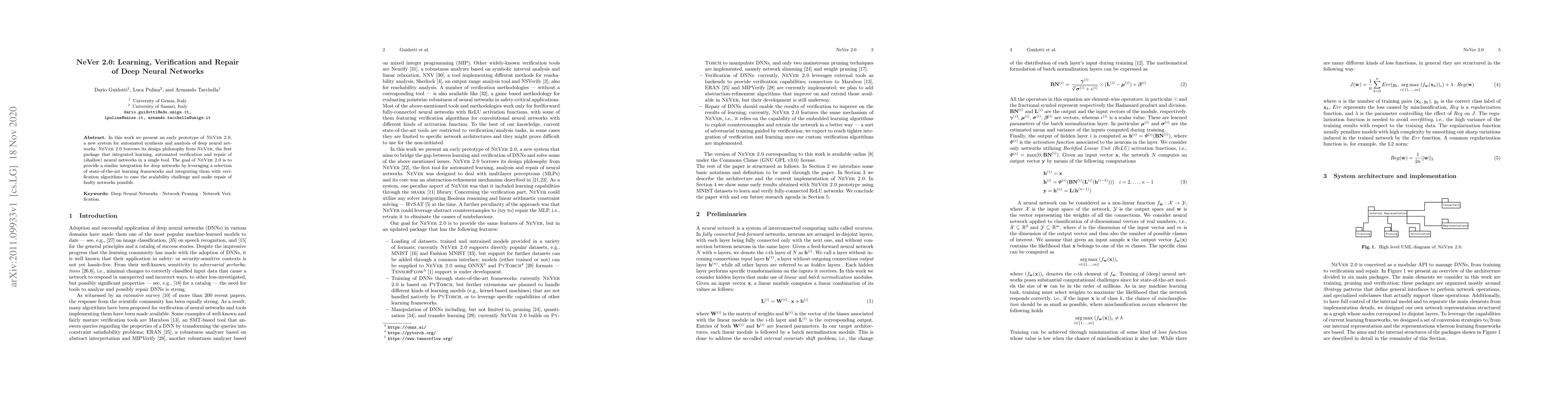 NeVer 2.0 is an advanced system designed for automated synthesis, verification, and repair of deep neural networks, building on the foundational concepts of its predecessor NeVer. It aims to tackle scalability issues and facilitate the repair of faulty networks using state-of-the-art learning frameworks and verification algorithms.