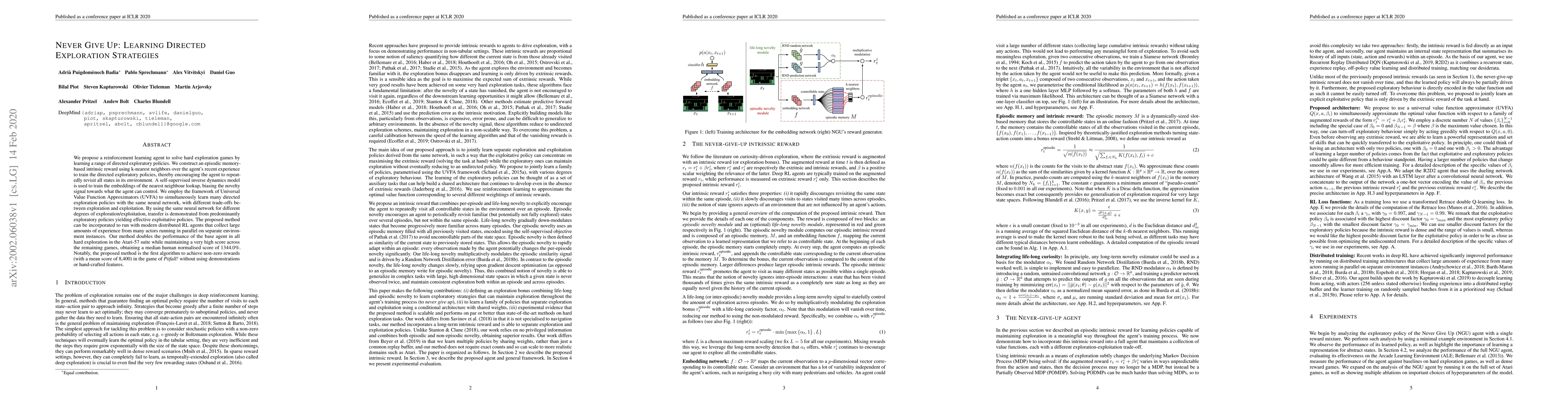 This paper introduces a reinforcement learning agent that employs directed exploration strategies to solve hard exploration games. It uses an episodic memory-based intrinsic reward and a self-supervised inverse dynamics model to train policies, achieving double the performance of a base agent in Atari-57 games, including non-zero rewards in Pitfall! without demonstrations or hand-crafted features.