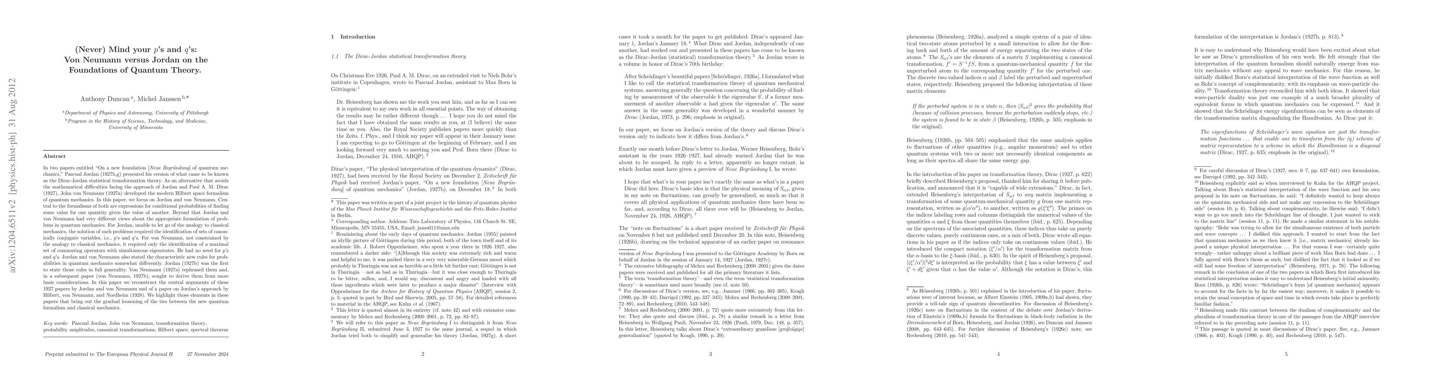 This paper compares the foundational approaches of Pascual Jordan and John von Neumann to quantum mechanics, focusing on their differing views on the appropriate formulation of quantum problems. While Jordan adhered to classical mechanics analogies, von Neumann developed the modern Hilbert space formalism, eschewing classical mechanics' p's and q's in favor of maximal sets of commuting operators.