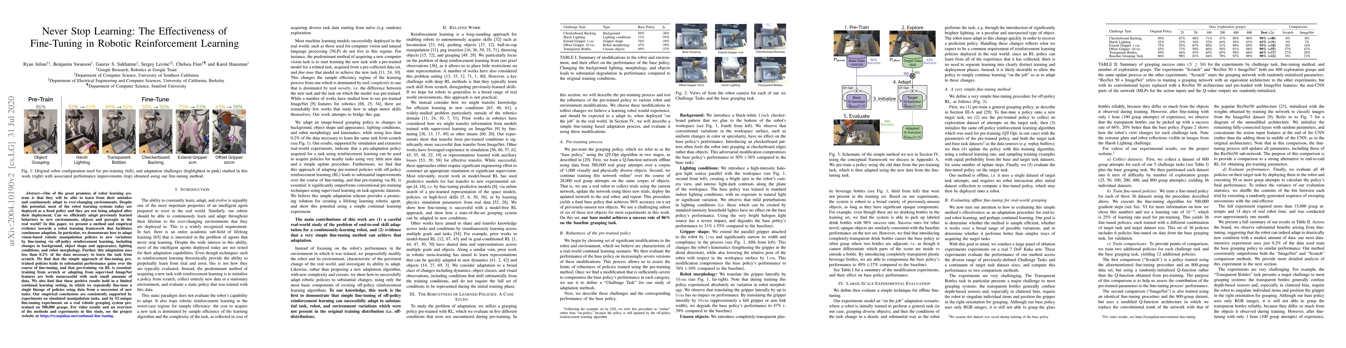 One of the great promises of robot learning systems is that they will be able to learn from their mistakes and continuously adapt to ever-changing environments. Despite this potential, most of the robot learning systems today are deployed as a fixed policy and they are not being adapted after their deployment. Can we efficiently adapt previously learned behaviors to new environments, objects and percepts in the real world? In this paper, we present a method and empirical evidence towards a robot learning framework that facilitates continuous adaption. In particular, we demonstrate how to adapt vision-based robotic manipulation policies to new variations by fine-tuning via off-policy reinforcement learning, including changes in background, object shape and appearance, lighting conditions, and robot morphology. Further, this adaptation uses less than 0.2% of the data necessary to learn the task from scratch. We find that our approach of adapting pre-trained policies leads to substantial performance gains over the course of fine-tuning, and that pre-training via RL is essential: training from scratch or adapting from supervised ImageNet features are both unsuccessful with such small amounts of data. We also find that these positive results hold in a limited continual learning setting, in which we repeatedly fine-tune a single lineage of policies using data from a succession of new tasks. Our empirical conclusions are consistently supported by experiments on simulated manipulation tasks, and by 52 unique fine-tuning experiments on a real robotic grasping system pre-trained on 580,000 grasps.